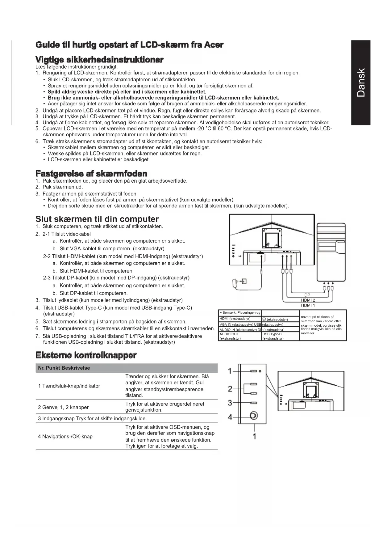 funktionen USB-opladning i slukket tilstand. (ekstraudstyr) ~ Bemærk: Placeringen og navnet på stikkene på skærmen kan variere efter skærmmodel, og visse stik findes muligvis ikke på alle modeller. HDMI (ekstraudstyr) (ekstraudstyr) VGA IN (ekstraudstyr) USB (ekstraudstyr) AUDIO IN (ekstraudstyr) DP (ekstraudstyr) AUDIO OUT (ekstraudstyr) USB Type-C (ekstraudstyr) Eksterne kontrolknapper Nr. Punkt Beskrivelse 1 Tænd/sluk-knap/indikator Tænder og slukker for skærmen. Blå angiver, at skærmen er tændt. Gul angiver standby/strømbesparende tilstand. 2 Genvej 1, 2 knapper Tryk for at aktivere brugerdefineret genvejsfunktion. 3 Indgangsknap Tryk for at skifte indgangskilde. 4 Navigations-/OK-knap Tryk for at aktivere OSD-menuen, og brug den derefter som navigationsknap til at fremhæve den ønskede funktion. Tryk igen for at foretage et valg. HDMI 2 HDMI 1 DPDansk Lovgivningsmæssige erklæringer og sikkerhedserklæringer FCC-erklæring Udstyret er afprøvet og overholder grænserne for digitale enheder i klasse B i henhold til del 15 i FCC-reglerne. Grænserne er beregnet til at give rimelig beskyttelse mod skadelig interferens, når udstyret er installeret i boligområder. Udstyret genererer, bruger, kan udstråle radiofrekvensenergi og kan, hvis det ikke er installeret og anvendes i overensstemmelse med anvisningerne, forårsage interferens for radiokommunikation. Der er imidlertid ingen garanti for, at interferens ikke kan opstå i en bestemt installation. Hvis enheden forårsager interferens for modtagelse af radio- og tv-signaler (hvilket kan afgøres med koblingsudstyret), anbefales det, at brugeren afhjælper interferensen på en eller flere af følgende måder: