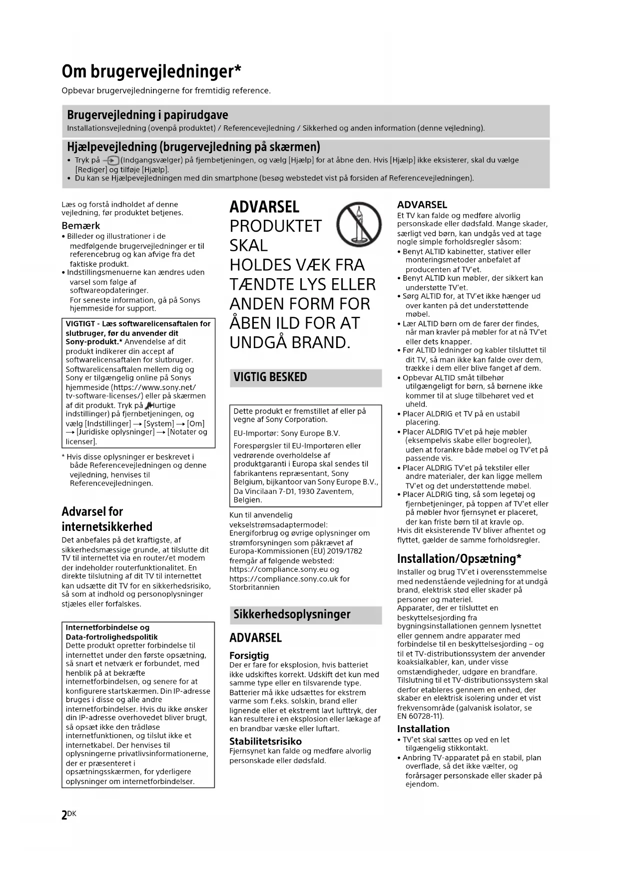 UNDGÅ BRAND. Kun til anvendelig vekselstrømsadaptermodel:Energiforbrug og øvrige oplysninger om strømforsyningen som påkrævet af Europa-Kommissionen (EU) 2019/1782 fremgår af følgende websted:https://compliance.sony.eu oghttps://compliance.sony.co.uk for Storbritannien ADVARSEL Forsigtig Der er fare for eksplosion, hvis batteriet ikke udskiftes korrekt. Udskift det kun med samme type eller en tilsvarende type.Batterier må ikke udsættes for ekstrem varme som f.eks. solskin, brand eller lignende eller et ekstremt lavt lufttryk, der kan resultere i en eksplosion eller lækage af en brandbar væske eller luftart. Stabilitetsrisiko Fjernsynet kan falde og medføre alvorlig personskade eller dødsfald. ADVARSEL Et TV kan falde og medføre alvorlig personskade eller dødsfald. Mange skader, særligt ved børn, kan undgås ved at tage nogle simple forholdsregler såsom:• Benyt ALTID kabinetter, stativer eller monteringsmetoder anbefalet af producenten af TV'et.• Benyt ALTID kun møbler, der sikkert kan understøtte TV'et.• Sørg ALTID for, at TV'et ikke hænger ud over kanten på det understøttende møbel.• Lær ALTID børn om de farer der findes, når man kravler på møbler for at nå TV'et eller dets knapper.• Før ALTID ledninger og kabler tilsluttet til dit TV, så man ikke kan falde over dem, trække i dem eller blive fanget af dem.• Opbevar ALTID småt tilbehør utilgængeligt for børn, så børnene ikke kommer til at sluge tilbehøret ved et uheld.• Placer ALDRIG et TV på en ustabil placering.• Placer ALDRIG TV'et på høje møbler (eksempelvis skabe eller bogreoler), uden at forankre både møbel og TV'et på passende vis.• Placer ALDRIG TV'et på tekstiler eller andre materialer, der kan ligge mellem TV'et og det understøttende møbel.• Placer ALDRIG ting, så som legetøj og fjernbetjeninger, på toppen af TV'et eller på møbler hvor fjernsynet er placeret, der kan friste børn til at kravle op.Hvis dit eksisterende TV bliver afhentet og flyttet, gælder de samme forholdsregler. Installation/Opsætning* Installer og brug TV'et i overensstemmelse med nedenstående vejledning for at undgå brand, elektrisk stød eller skader på personer og materiel.Apparater, der er tilsluttet en beskyttelsesjording fra bygningsinstallationen gennem lysnettet eller gennem andre apparater med forbindelse til en beskyttelsesjording – og til et TV-distributionssystem der anvender koaksialkabler, kan, under visse omstændigheder, udgøre en brandfare. Tilslutning til et TV-distributionssystem skal derfor etableres gennem en enhed, der skaber en elektrisk isolering under et vist frekvensområde (galvanisk isolator, se EN 60728-11). Installation