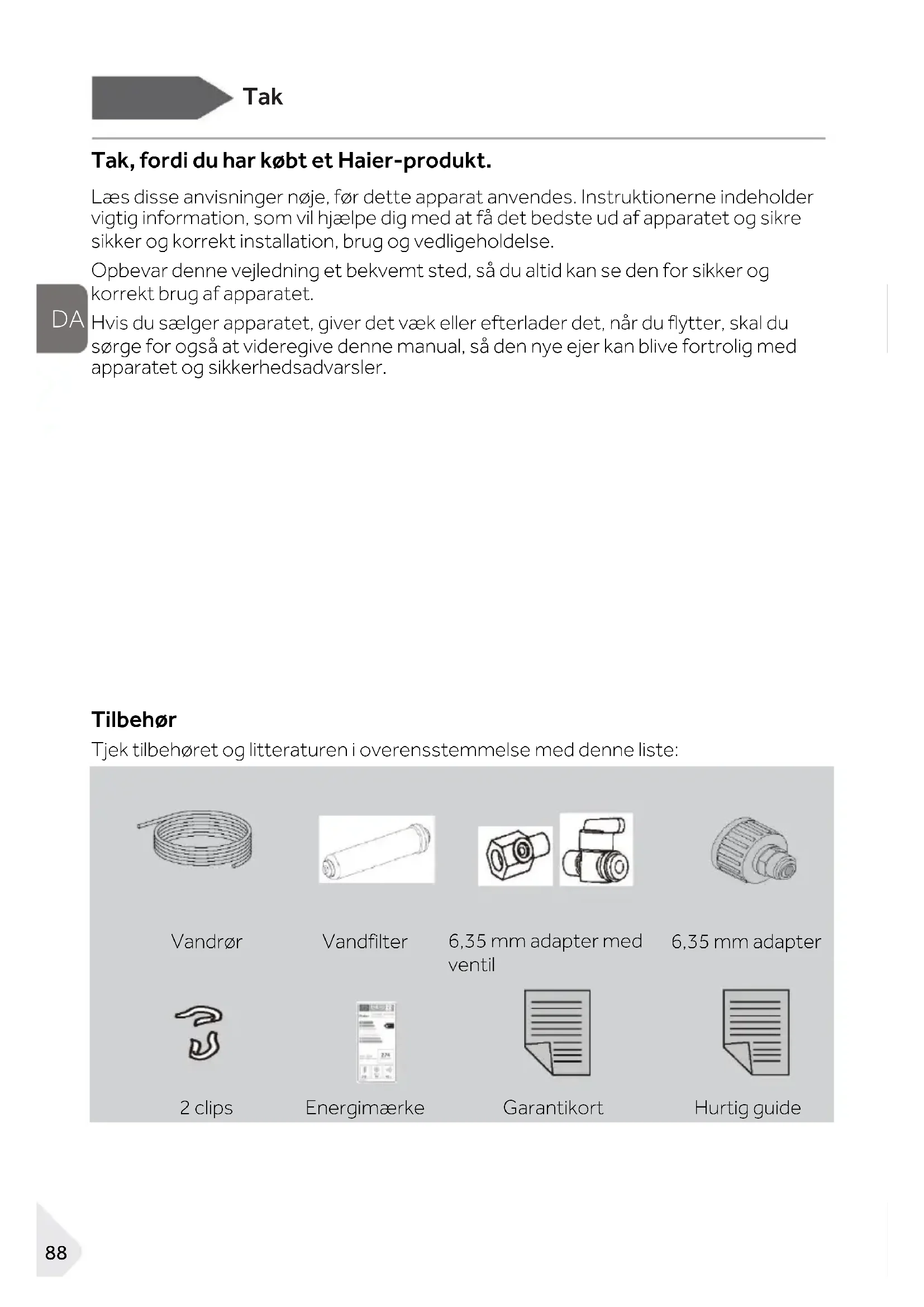 Tak, fordi du har købt et Haier-produkt. Læs disse anvisninger nøje, før dette apparat anvendes. Instruktionerne indeholder vigtig information, som vil hjælpe dig med at få det bedste ud af apparatet og sikre sikker og korrekt installation, brug og vedligeholdelse. Opbevar denne vejledning et bekvemt sted, så du altid kan se den for sikker og korrekt brug af apparatet. Hvis du sælger apparatet, giver det væk eller efterlader det, når du flytter, skal du sørge for også at videregive denne manual, så den nye ejer kan blive fortrolig med apparatet og sikkerhedsadvarsler. Tilbehør Tjek tilbehøret og litteraturen i overensstemmelse med denne liste: