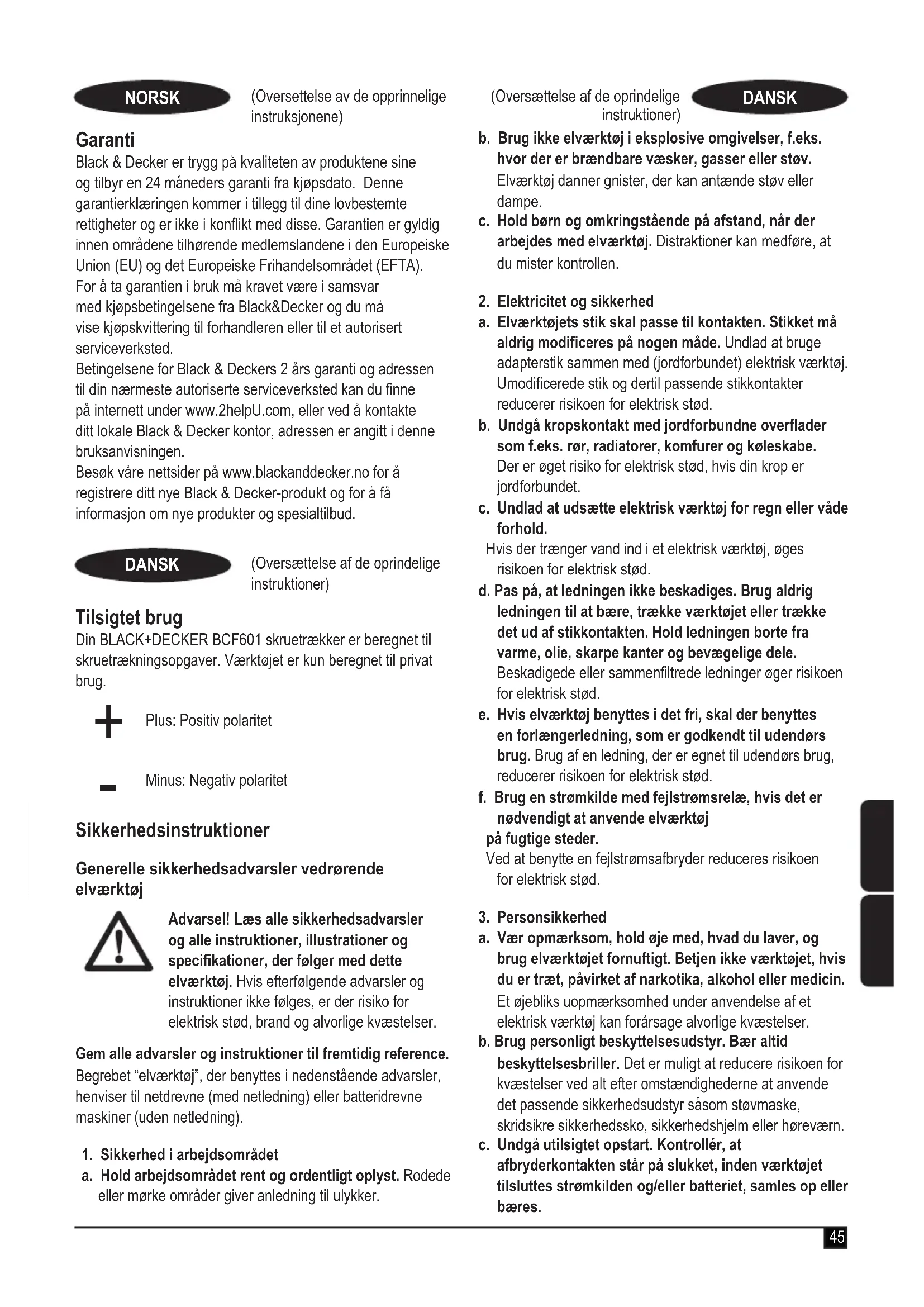 (Oversettelse av de opprinnelige instruksjonene) NORSK (Oversættelse af de oprindelige instruktioner) DANSK Tilsigtet brug Din BLACK+DECKER BCF601 skruetrækker er beregnet til skruetrækningsopgaver. Værktøjet er kun beregnet til privat brug.