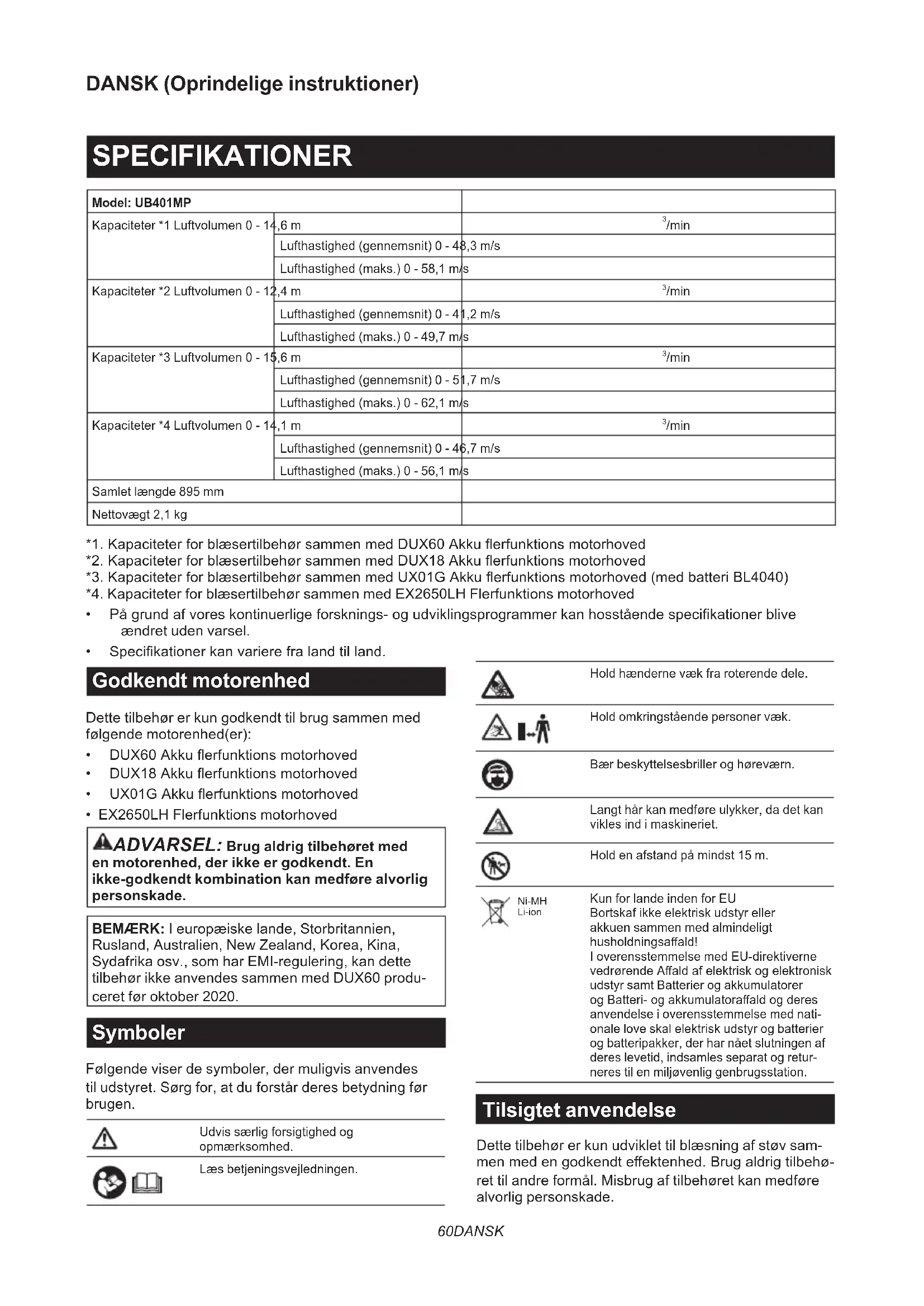 - EX2650LH Flerfunktions motorhoved ADVARSEL: Brug aldrig tilbehøret med en motorenhed, der ikke er godkendt. En ikke-godkendt kombination kan medføre alvorlig personskade. BEMÆRK: I europæiske lande, Storbritannien, Rusland, Australien, New Zealand, Korea, Kina, Sydafrika osv., som har EMI-regulering, kan dette tilbehør ikke anvendes sammen med DUX60 produ- ceret før oktober 2020. Symboler Følgende viser de symboler, der muligvis anvendes til udstyret. Sørg for, at du forstår deres betydning før brugen. Udvis særlig forsigtighed og opmærksomhed. Læs betjeningsvejledningen. Hold hænderne væk fra roterende dele. Hold omkringstående personer væk. Bær beskyttelsesbriller og høreværn. Langt hår kan medføre ulykker, da det kan vikles ind i maskineriet. Hold en afstand på mindst 15 m. Ni-MH Li-ion Kun for lande inden for EU Bortskaf ikke elektrisk udstyr eller akkuen sammen med almindeligt husholdningsaald! I overensstemmelse med EU-direktiverne vedrørendeAaldafelektriskogelektronisk udstyr samt Batterier og akkumulatorer ogBatteri-ogakkumulatoraaldogderes anvendelse i overensstemmelse med nati- onale love skal elektrisk udstyr og batterier og batteripakker, der har nået slutningen af deres levetid, indsamles separat og retur- neres til en miljøvenlig genbrugsstation. Tilsigtet anvendelse Dette tilbehør er kun udviklet til blæsning af støv sam- menmedengodkendteektenhed.Brugaldrigtilbehø- ret til andre formål. Misbrug af tilbehøret kan medføre alvorlig personskade.61 DANSK EF-overensstemmelseserklæring Kun for lande i Europa Vi som producenter: Makita Europe N.V., Forretningsadresse: Jan-Baptist Vinkstraat 2 3070 Kortenberg BELGIEN. Godkender Hiroshi Tsujimura tilkompileringafdentekniskelogtagerdetfulde ansvar for, at produktet eller produkterne, Betegnelse: Blæsertilbehør. Betegnelse for type(r): UB401MP. Opfylder alle de relevante bestemmelser i 2006/42/ EF og opfylder desuden alle relevante bestemmelser i følgende EF/EU-direktiver: 2000/14/EF og er fremstillet i overensstemmelse med følgende harmoniserede standarder: EN 15503:2009+A1:2013+A2:2015, EN 50636-2-100:2014. Sted og dato for erklæring: Kortenberg, Belgien. 29.