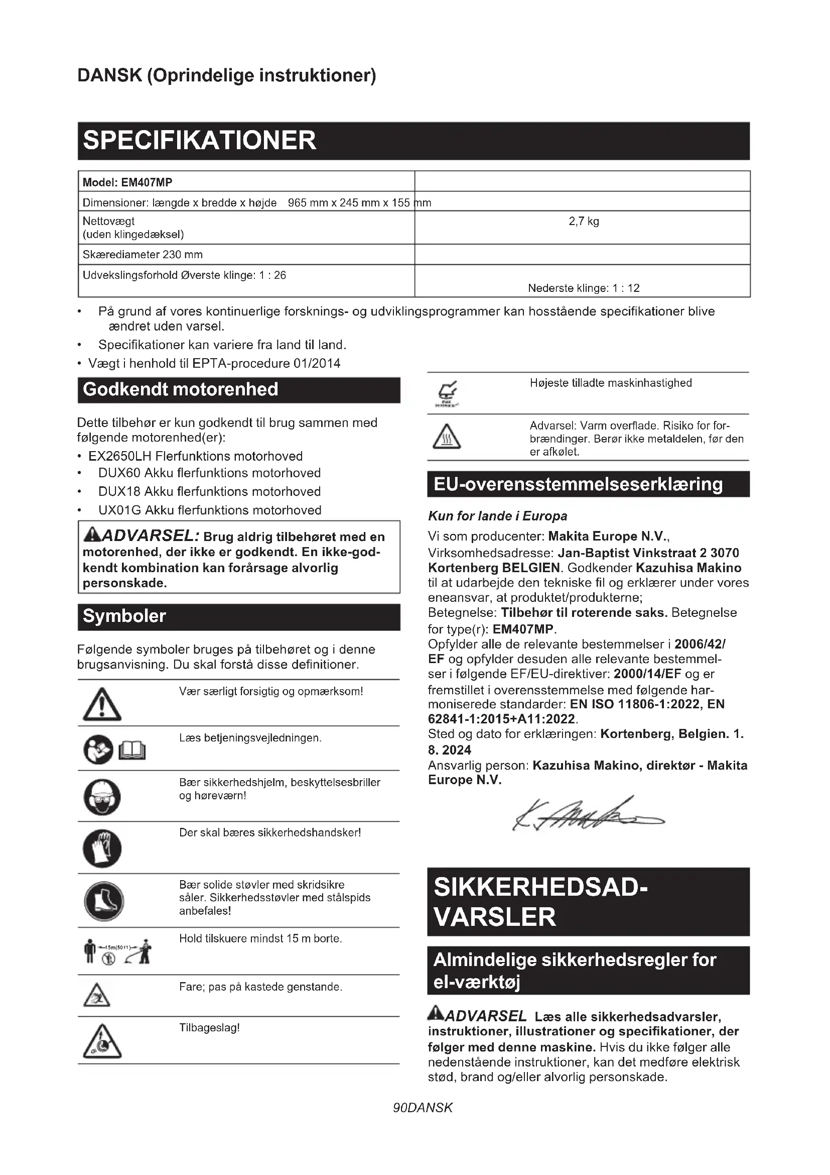 Hold tilskuere mindst 15 m borte.Fare; pas på kastede genstande.Tilbageslag!HøjestetilladtemaskinhastighedAdvarsel:Varmoverade.Risikoforfor-brændinger. Berør ikke metaldelen, før den er afkølet. EU-overensstemmelseserklæring Kun for lande i Europa Vi som producenter: Makita Europe N.V., Virksomhedsadresse: Jan-Baptist Vinkstraat 2 3070 Kortenberg BELGIEN. Godkender Kazuhisa Makino tilatudarbejdedentekniskelogerklærerundervores eneansvar, at produktet/produkterne; Betegnelse: Tilbehør til roterende saks. Betegnelse fortype(r):EM407MP. Opfylderallederelevantebestemmelseri2006/42/ EFogopfylderdesudenallerelevantebestemmel- ser i følgende EF/EU-direktiver: 2000/14/EF og er fremstillet i overensstemmelse med følgende har- moniserede standarder: EN ISO 11806-1:2022, EN 62841-1:2015+A11:2022. Sted og dato for erklæringen: Kortenberg, Belgien. 1.