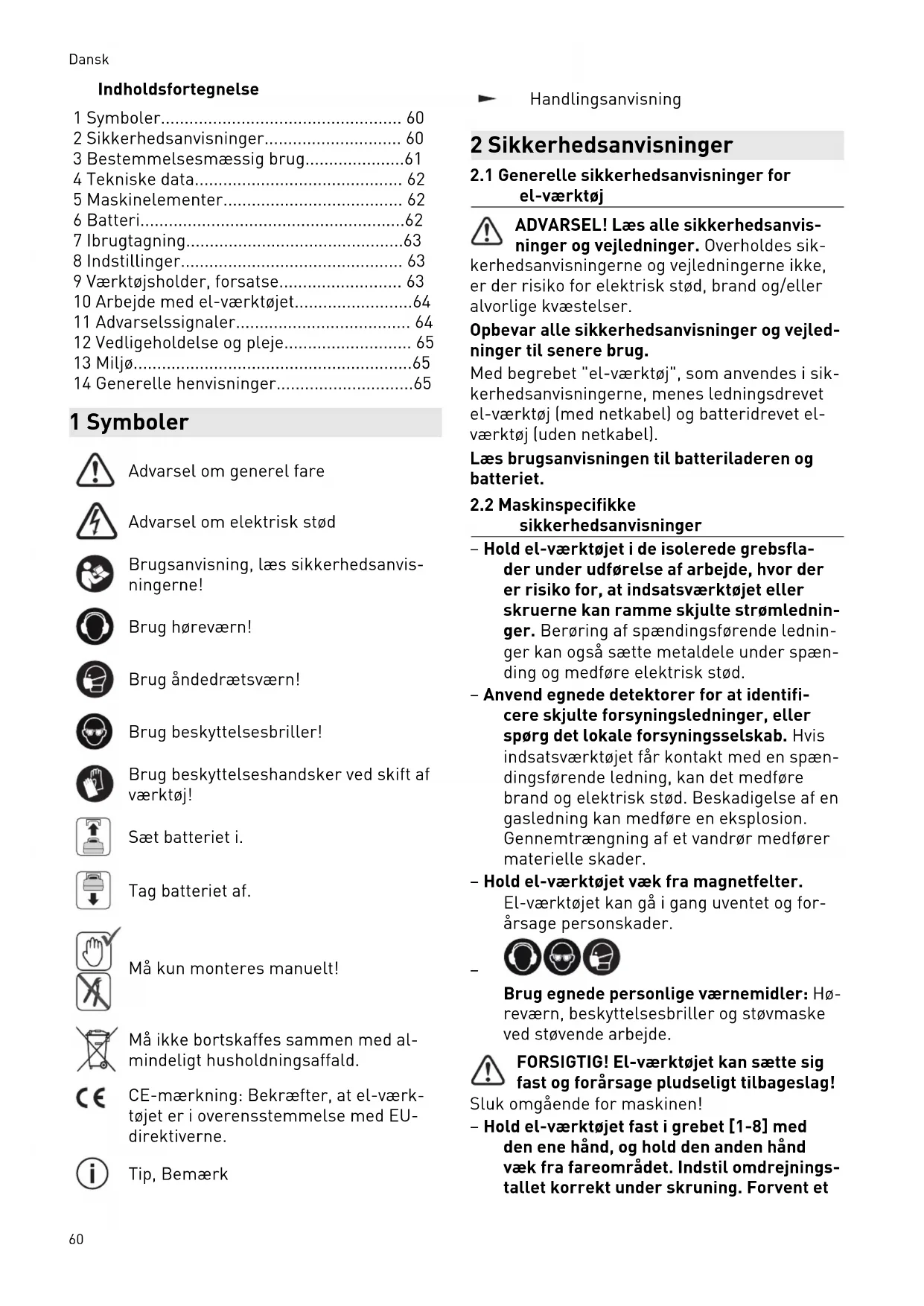 - 14 Generelle henvisninger 1 Symboler Advarsel om generel fare Advarsel om elektrisk stød Brugsanvisning, læs sikkerhedsanvis ningerne! Brug høreværn! Brug åndedrætsværn! Brug beskyttelsesbriller! Brug beskyttelseshandsker ved skift af værktøj! Sæt batteriet i. Tag batteriet af. Må kun monteres manuelt! Må ikke bortskaffes sammen med al mindeligt husholdningsaffald. CE-mærkning: Bekræfter, at el-værk tøjet er i overensstemmelse med EU- direktiverne. Tip, Bemærk Handlingsanvisning 2 Sikkerhedsanvisninger p. 65