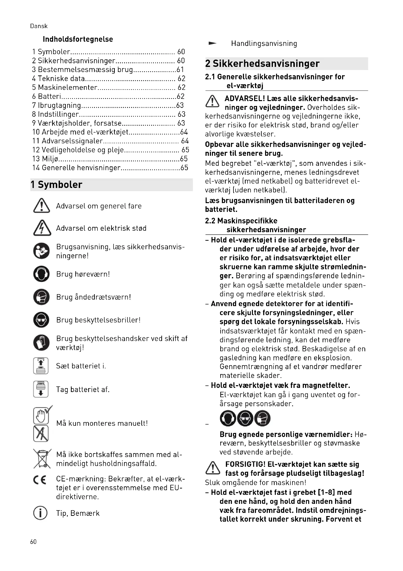 - 14 Generelle henvisninger 1 Symboler Advarsel om generel fare Advarsel om elektrisk stød Brugsanvisning, læs sikkerhedsanvis ningerne! Brug høreværn! Brug åndedrætsværn! Brug beskyttelsesbriller! Brug beskyttelseshandsker ved skift af værktøj! Sæt batteriet i. Tag batteriet af. Må kun monteres manuelt! Må ikke bortskaffes sammen med al mindeligt husholdningsaffald. CE-mærkning: Bekræfter, at el-værk tøjet er i overensstemmelse med EU- direktiverne. Tip, Bemærk Handlingsanvisning 2 Sikkerhedsanvisninger p. 65