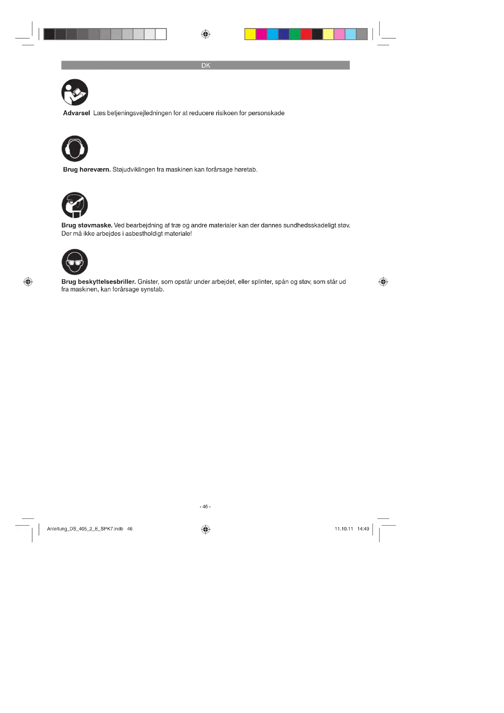 Advarsel Læs betjeningsvejledningen for at reducere risikoen for personskade Brug høreværn. Støjudviklingen fra maskinen kan forårsage høretab. Brug beskyttelsesbriller. Gnister, som opstår under arbejdet, eller splinter, spån og støv, som står ud fra maskinen, kan forårsage synstab. Brug støvmaske. Ved bearbejdning af træ og andre materialer kan der dannes sundhedsskadeligt støv. Der må ikke arbejdes i asbestholdigt materiale! Anleitung_DS_405_2_E_SPK7.indb 46Anleitung_DS_405_2_E_SPK7.indb 46 11.10.11 14:4911.10.11 14:49DK
