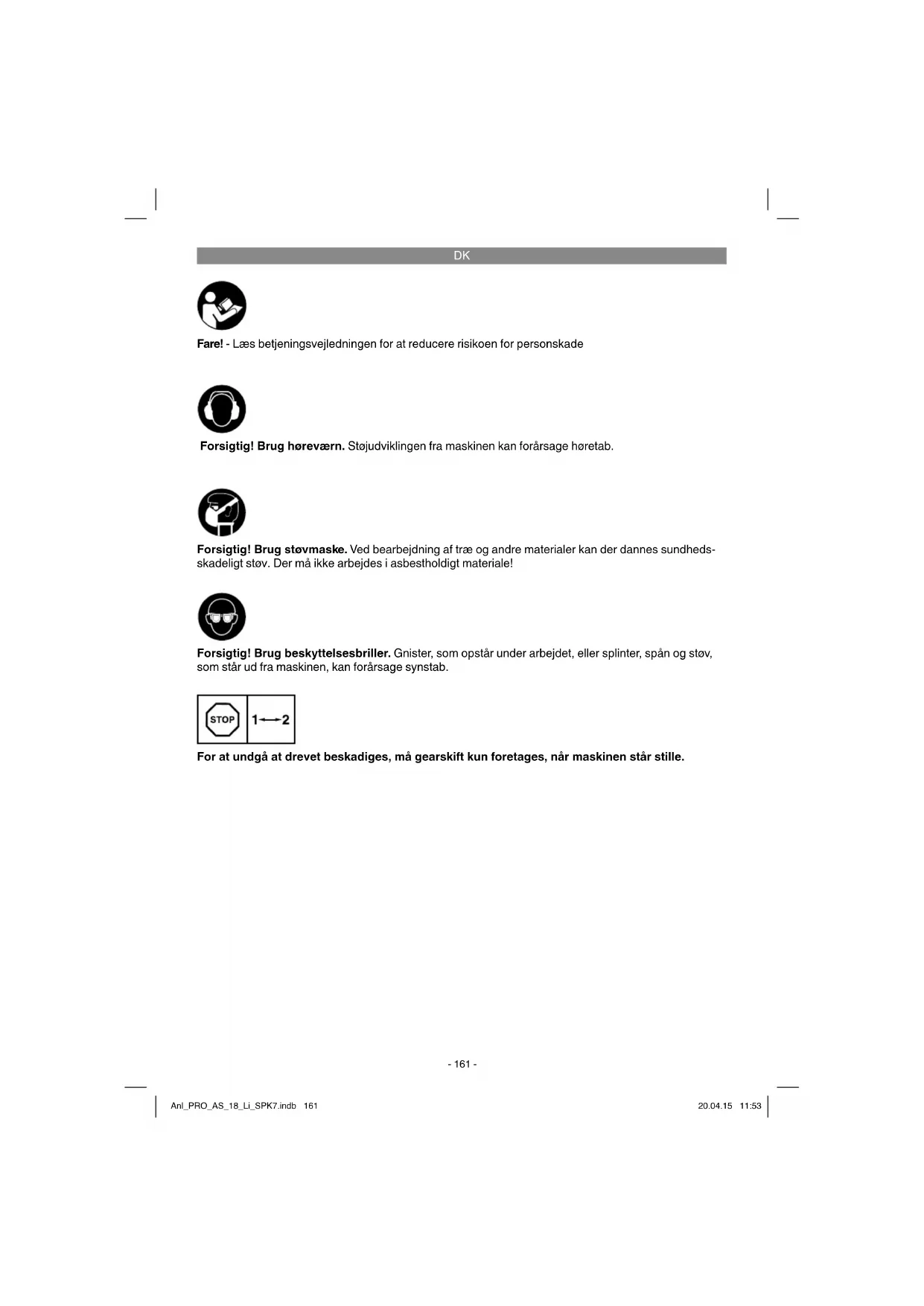Fare! - Læs betjeningsvejledningen for at reducere risikoen for personskade Forsigtig! Brug høreværn. Støjudviklingen fra maskinen kan forårsage høretab. Forsigtig! Brug beskyttelsesbriller. Gnister, som opstår under arbejdet, eller splinter, spån og støv, som står ud fra maskinen, kan forårsage synstab. Forsigtig! Brug støvmaske. Ved bearbejdning af træ og andre materialer kan der dannes sundheds- skadeligt støv. Der må ikke arbejdes i asbestholdigt materiale! For at undgå at drevet beskadiges, må gearskift kun foretages, når maskinen står stille. Anl_PRO_AS_18_Li_SPK7.indb 161Anl_PRO_AS_18_Li_SPK7.indb 161 20.04.15 11:5320.04.15 11:53DK