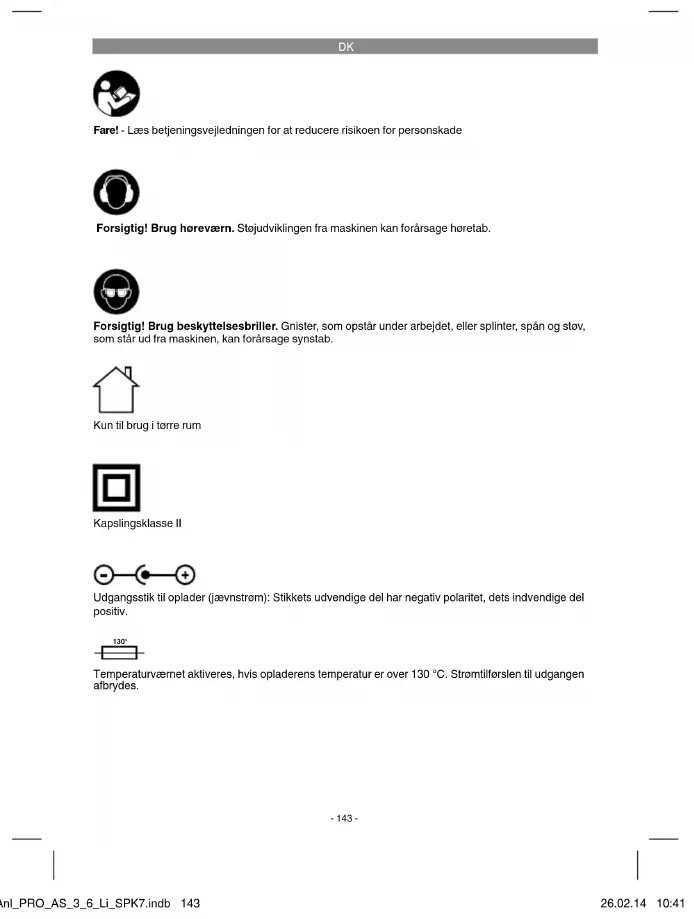Fare! - Læs betjeningsvejledningen for at reducere risikoen for personskade Forsigtig! Brug høreværn. Støjudviklingen fra maskinen kan forårsage høretab. Forsigtig! Brug beskyttelsesbriller. Gnister, som opstår under arbejdet, eller splinter, spån og støv, som står ud fra maskinen, kan forårsage synstab. Kun til brug i tørre rum Kapslingsklasse II Udgangsstik til oplader (jævnstrøm): Stikkets udvendige del har negativ polaritet, dets indvendige del positiv. 130° Temperaturværnet aktiveres, hvis opladerens temperatur er over 130 °C. Strømtilførslen til udgangen afbrydes. Anl_PRO_AS_3_6_Li_SPK7.indb 143Anl_PRO_AS_3_6_Li_SPK7.indb 143 26.02.14 10:4126.02.14 10:41DK