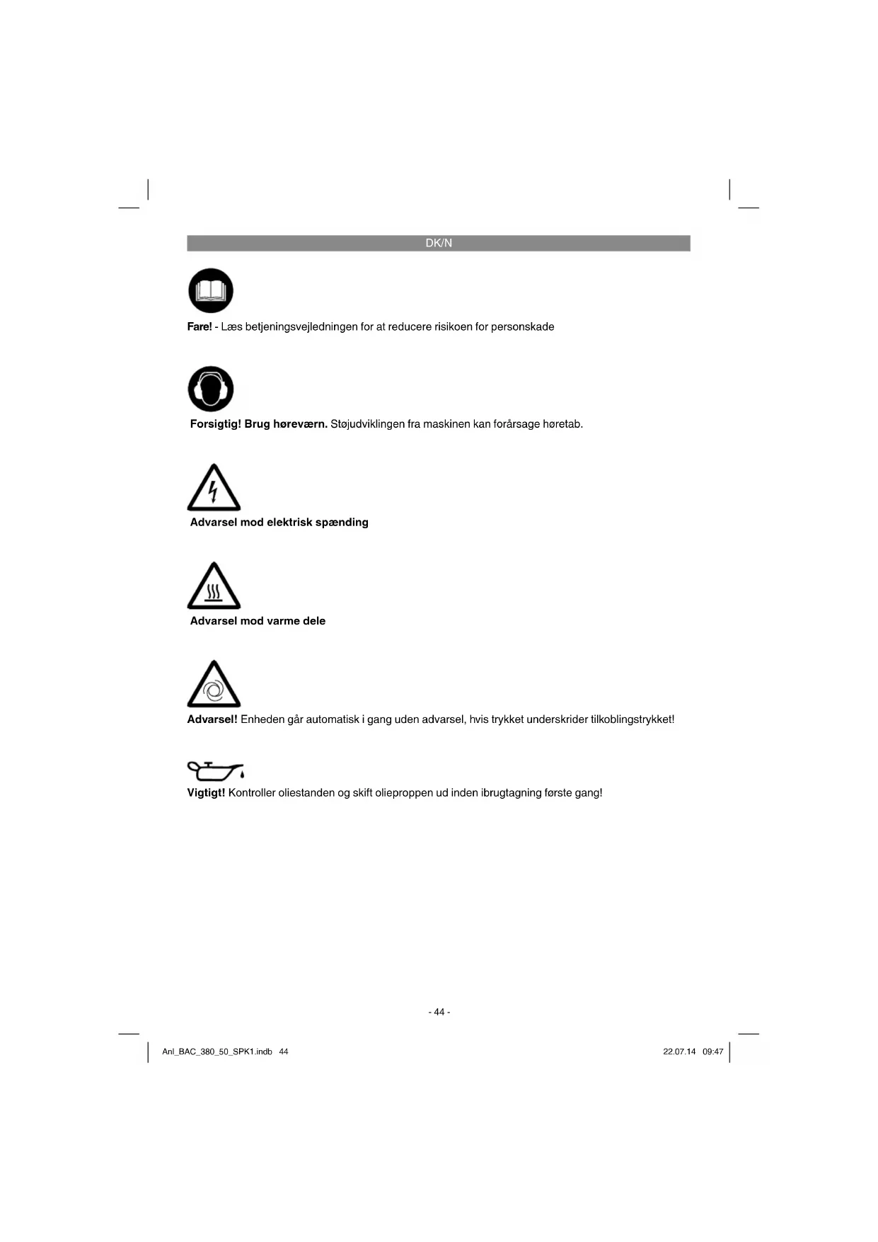 Forsigtig! Brug høreværn. Støjudviklingen fra maskinen kan forårsage høretab. Fare! - Læs betjeningsvejledningen for at reducere risikoen for personskade Advarsel mod elektrisk spænding Advarsel mod varme dele Advarsel! Enheden går automatisk i gang uden advarsel, hvis trykket underskrider tilkoblingstrykket! Vigtigt! Kontroller oliestanden og skift olieproppen ud inden ibrugtagning første gang! Anl_BAC_380_50_SPK1.indb 44Anl_BAC_380_50_SPK1.indb 44 22.07.14 09:4722.07.14 09:47DK/N