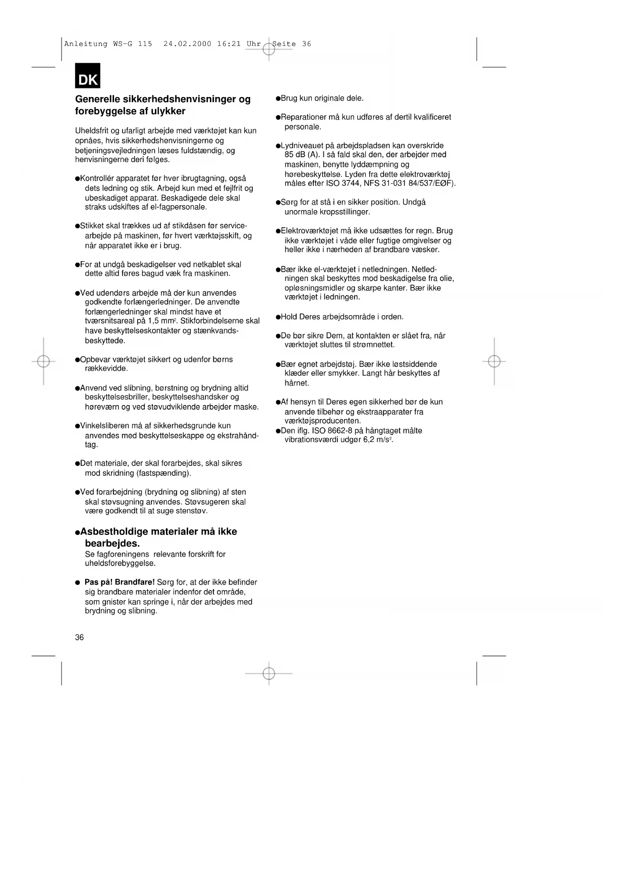 flangia di serraggio dado flangiato Posizione della flangia se si impiega una mola per troncatura diritta Anleitung WS-G 115 24.02.2000 16:21 Uhr Seite 3536 Generelle sikkerhedshenvisninger og forebyggelse af ulykker Uheldsfrit og ufarligt arbejde med værktøjet kan kun opnåes, hvis sikkerhedshenvisningerne og betjeningsvejledningen læses fuldstændig, og henvisningerne deri følges. Kontrollér apparatet før hver ibrugtagning, også dets ledning og stik. Arbejd kun med et fejlfrit og ubeskadiget apparat. Beskadigede dele skal straks udskiftes af el-fagpersonale. Stikket skal trækkes ud af stikdåsen før service- arbejde på maskinen, før hvert værktøjsskift, og når apparatet ikke er i brug. For at undgå beskadigelser ved netkablet skal dette altid føres bagud væk fra maskinen. Ved udendørs arbejde må der kun anvendes godkendte forlængerledninger. De anvendte forlængerledninger skal mindst have et tværsnitsareal på 1,5 mm