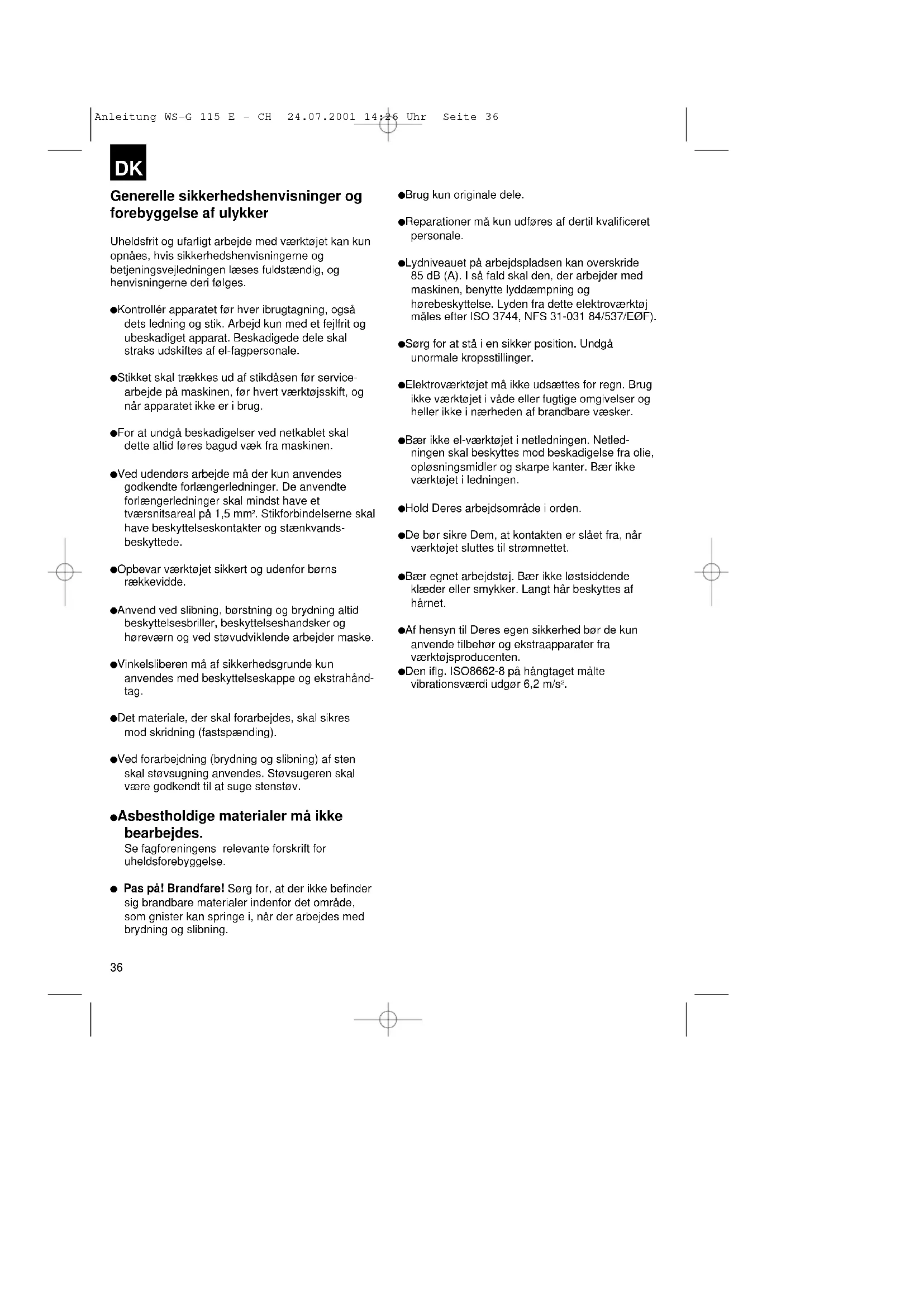flangia di serraggio dado flangiato Posizione della flangia se si impiega una mola per troncatura diritta Anleitung WS-G 115 E - CH 24.07.2001 14:26 Uhr Seite 3536 Generelle sikkerhedshenvisninger og forebyggelse af ulykker Uheldsfrit og ufarligt arbejde med værktøjet kan kun opnåes, hvis sikkerhedshenvisningerne og betjeningsvejledningen læses fuldstændig, og henvisningerne deri følges. Kontrollér apparatet før hver ibrugtagning, også dets ledning og stik. Arbejd kun med et fejlfrit og ubeskadiget apparat. Beskadigede dele skal straks udskiftes af el-fagpersonale. Stikket skal trækkes ud af stikdåsen før service- arbejde på maskinen, før hvert værktøjsskift, og når apparatet ikke er i brug. For at undgå beskadigelser ved netkablet skal dette altid føres bagud væk fra maskinen. Ved udendørs arbejde må der kun anvendes godkendte forlængerledninger. De anvendte forlængerledninger skal mindst have et tværsnitsareal på 1,5 mm