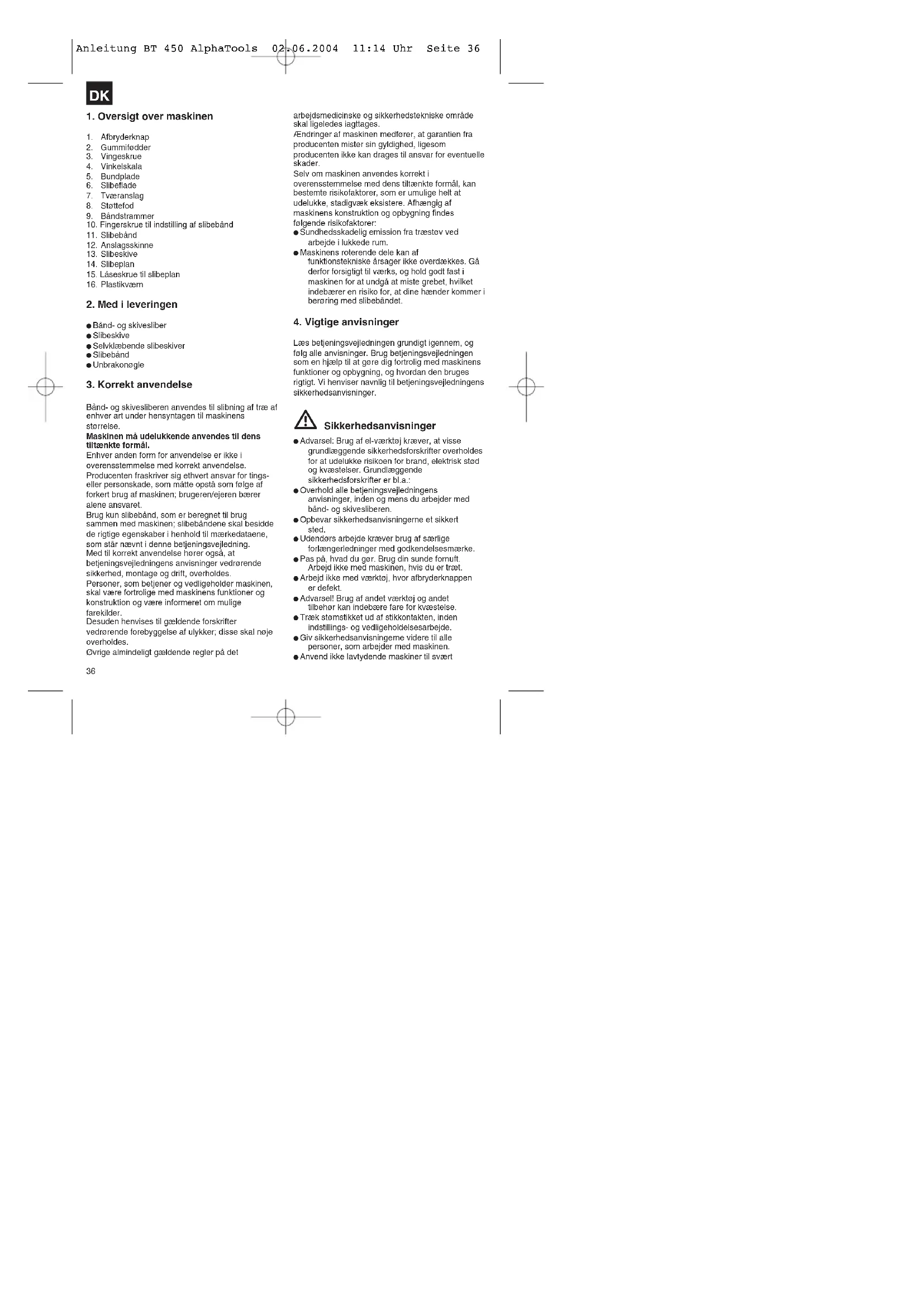 Anleitung BT 450 AlphaTools 02.06.2004 11:14 Uhr Seite 36arbejde. Brug ikke ledningen til formål, den ikke er beregnet til! Sørg for at stå godt fast og altid være i balance. Efterse maskinen for eventuelle skader! Inden maskinen tages i brug igen, skal beskyttelsesanordninger eller let beskadigede dele kontrolleres omhyggeligt for at se, om de virker, som de skal. Kontroller, at bevægelige dele fungerer fejlfrit og ikke binder, og at dele ikke er beskadigede. Samtlige dele skal være rigtigt monteret og opfylde alle betingelser for en sikker drift af maskinen. Beskadigede beskyttelsesanordninger og dele skal repareres eller skiftes ud på autoriseret værksted, med mindre andet står nævnt i betjeningsvejledningen. Beskadigede afbrydere skal skiftes ud på kundeserviceværksted. Denne maskine imødekommer kravene i gældende sikkerhedsbestemmelser. Afstanden mellem slibeskive (13) og slibeplan (14) må være højst 1,6 mm. Arbejd altid med anslagsskinne (12) eller slibeplan (14). Bemærk også de alm. sikkerhedsanvisninger i tillægget! Advarsel Læs betjeningsvejledningen, inden maskinen tages i brug Beskyt maskinen mod regn og fugt Bær handsker Brug øjenværn Bær støvværn