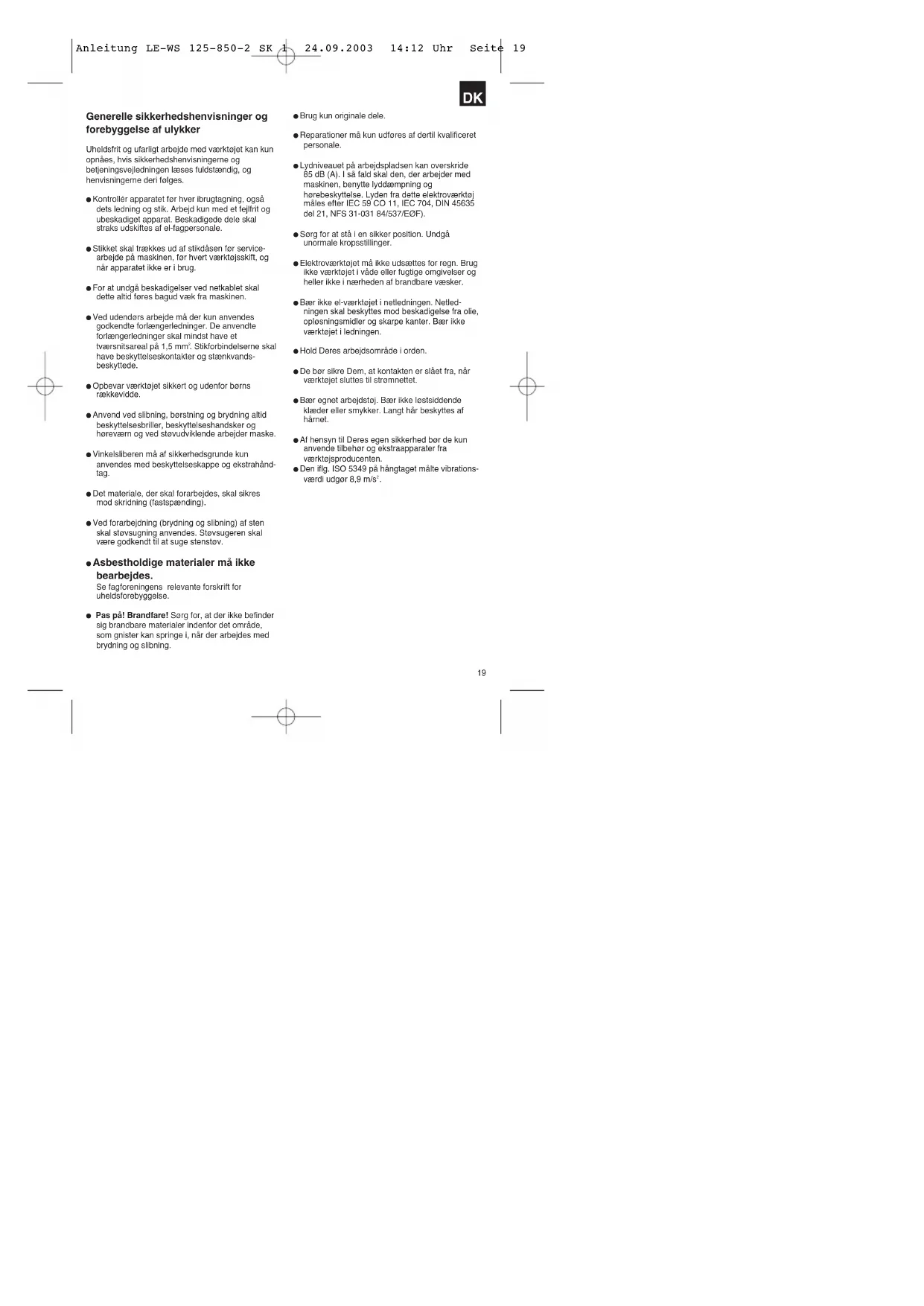 flangia di serraggio dado flangiato Posizione della flangia se si impiega una mola per troncatura diritta Anleitung LE-WS 125-850-2 SK 1 24.09.2003 14:12 Uhr Seite 1819 Generelle sikkerhedshenvisninger og forebyggelse af ulykker Uheldsfrit og ufarligt arbejde med værktøjet kan kun opnåes, hvis sikkerhedshenvisningerne og betjeningsvejledningen læses fuldstændig, og henvisningerne deri følges. Kontrollér apparatet før hver ibrugtagning, også dets ledning og stik. Arbejd kun med et fejlfrit og ubeskadiget apparat. Beskadigede dele skal straks udskiftes af el-fagpersonale. Stikket skal trækkes ud af stikdåsen før service- arbejde på maskinen, før hvert værktøjsskift, og når apparatet ikke er i brug. For at undgå beskadigelser ved netkablet skal dette altid føres bagud væk fra maskinen. Ved udendørs arbejde må der kun anvendes godkendte forlængerledninger. De anvendte forlængerledninger skal mindst have et tværsnitsareal på 1,5 mm