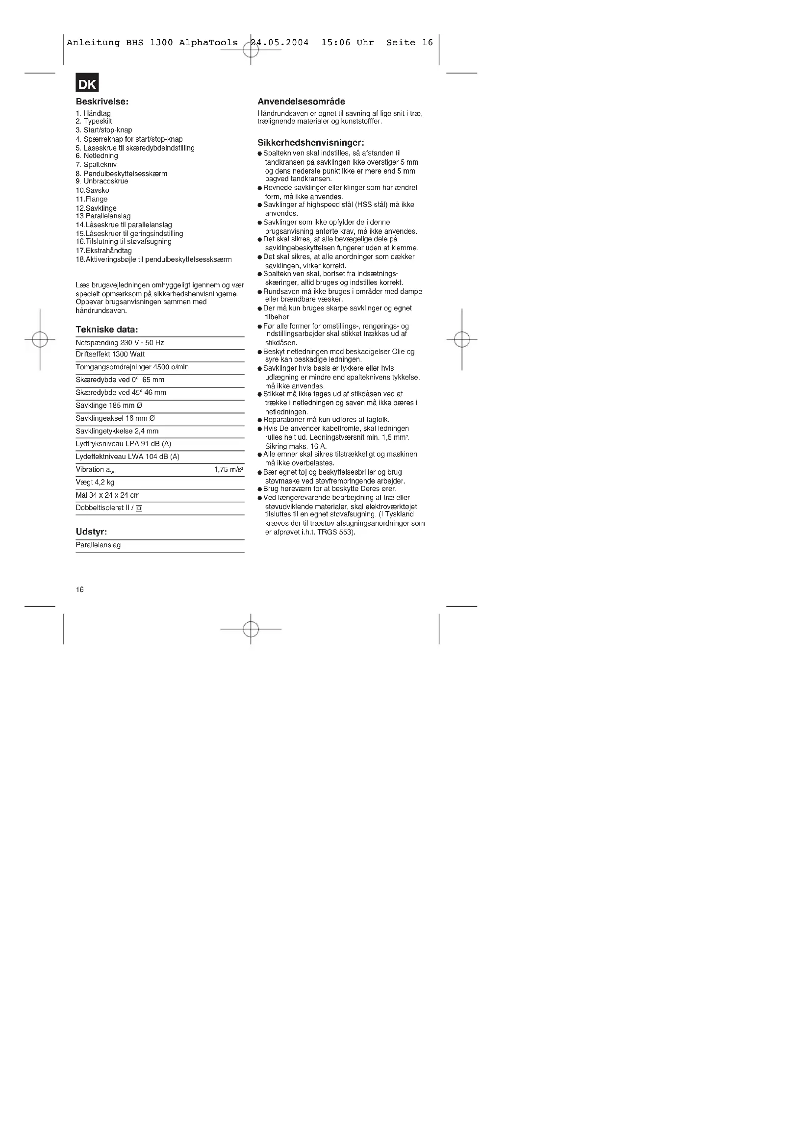 Sikring maks. 16 A. Alle emner skal sikres tilstrækkeligt og maskinen må ikke overbelastes. Bær egnet tøj og beskyttelsesbriller og brug støvmaske ved støvfrembringende arbejder. Brug høreværn for at beskytte Deres ører. Ved længerevarende bearbejdning af træ eller støvudviklende materialer, skal elektroværktøjet tilsluttes til en egnet støvafsugning. (I Tyskland kræves der til træstøv afsugningsanordninger som er afprøvet i.h.t. TRGS 553). Anleitung BHS 1300 AlphaTools 24.05.2004 15:06 Uhr Seite 161