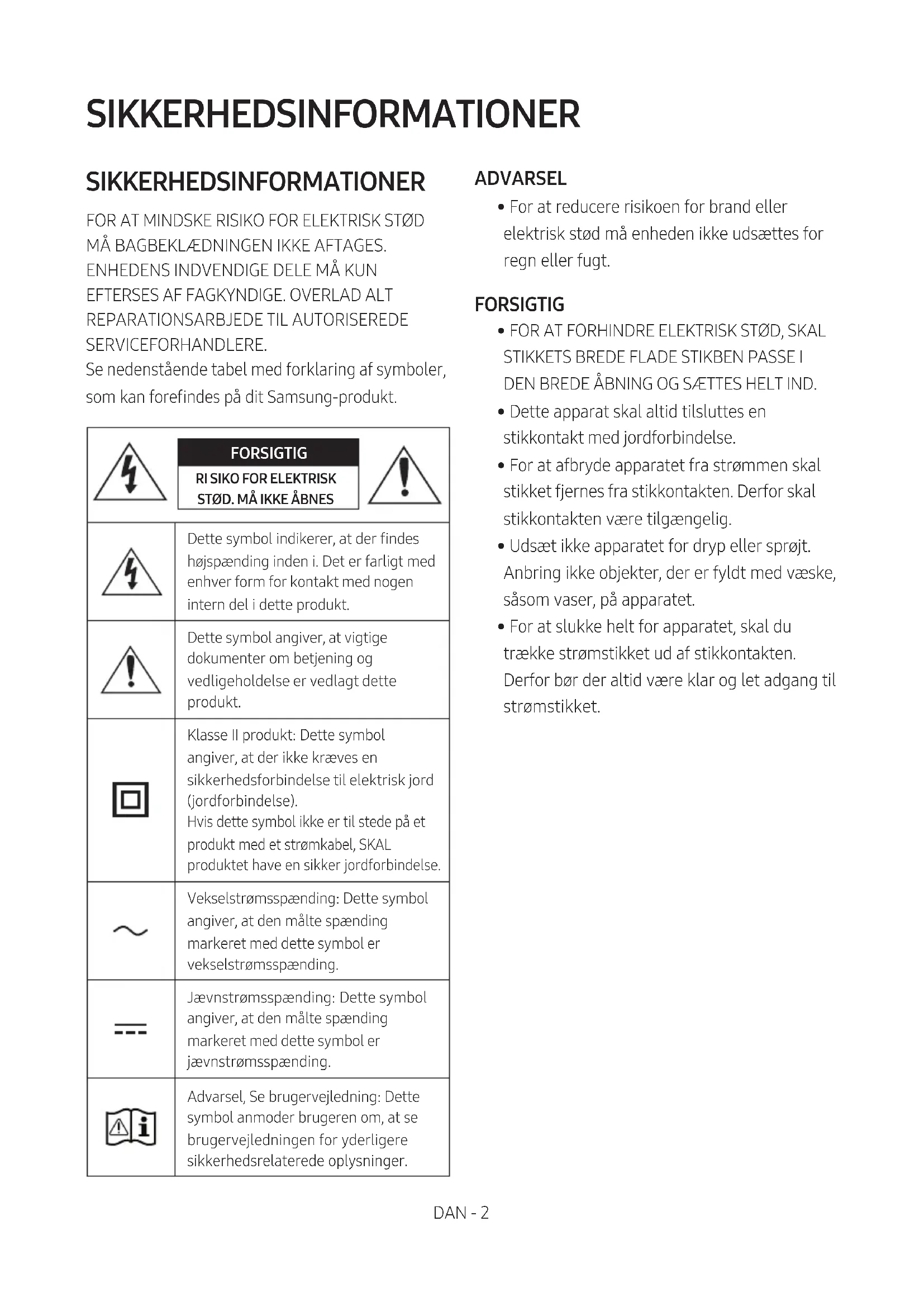 SERVICEFORHANDLERE. Se nedenstående tabel med forklaring af symboler, som kan forendes på dit Samsung-produkt. FORSIGTIG RI SIKO FOR ELEKTRISK STØD. MÅ IKKE ÅBNESDette symbol indikerer, at der ndes højspænding inden i. Det er farligt med enhver form for kontakt med nogen intern del i dette produkt.Dette symbol angiver, at vigtige dokumenter om betjening og vedligeholdelse er vedlagt dette produkt.Klasse II produkt: Dette symbol angiver, at der ikke kræves en sikkerhedsforbindelse til elektrisk jord (jordforbindelse).Hvis dette symbol ikke er til stede på et produkt med et strømkabel, SKAL produktet have en sikker jordforbindelse. Vekselstrømsspænding: Dette symbol angiver, at den målte spænding markeret med dette symbol er vekselstrømsspænding.Jævnstrømsspænding: Dette symbol angiver, at den målte spænding markeret med dette symbol er jævnstrømsspænding.Advarsel, Se brugervejledning: Dette symbol anmoder brugeren om, at se brugervejledningen for yderligere sikkerhedsrelaterede oplysninger. ADVARSEL