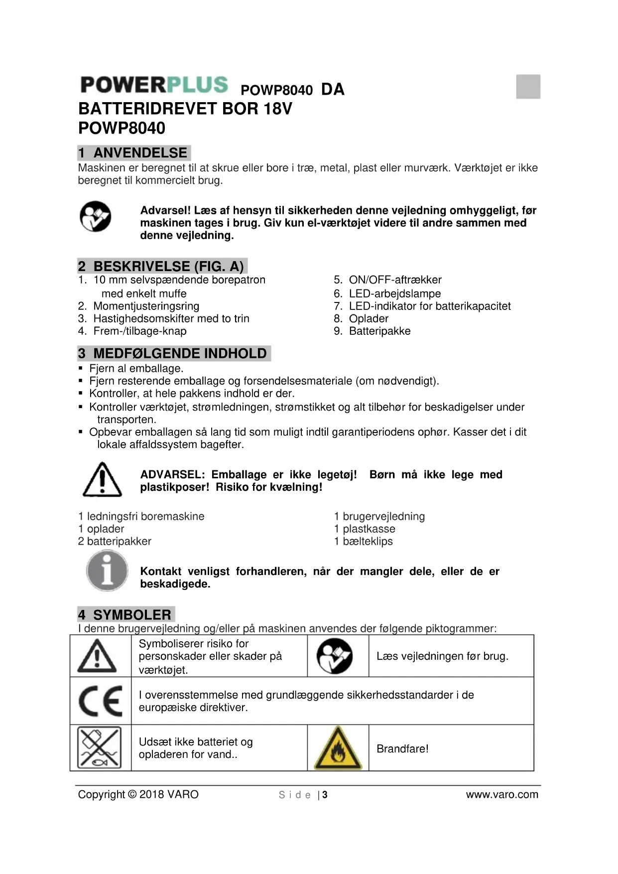 Dette produkt indeholder Li-ion. For at bevare naturen skal batterierne genbruges eller bortskaffes på korrekt vis. Det kan være ulovligt at smide Li-ion-batterier ud sammen med almindeligt affald. Forhør dig hos dit lokale affaldsdepot for yderligere information om genbrugs- og bortskaffelsesmuligheder.POWP8040 DA Copyright © 2018 VARO S i d e | 11 www.varo.com 14 KONFORMITETSERKLÆRING VARO N.V – Joseph Van Instraat 9 – BE2500 Lier – Belgien, erklærer hermed, at Apparatbeskrivelse: Batteridrevet bor Varemærke: POWERplus Varenummer: POWP8040 er i overensstemmelse med de væsentlige krav og andre relevante bestemmelser i gældende europæiske direktiver, der er baseret på anvendelse af europæiske harmoniserede standarder. Enhver uautoriseret modifikation af apparatet ugyldiggør denne erklæring. EU-direktiver (herunder eventuelle tillæg frem til datoen for undertegnelsen): 2014/30/EU 2006/42/EF 2011/65/EU Harmoniserede europæiske standarder (herunder eventuelle tillæg frem til datoen for undertegnelsen): EN60745-1 : 2009 EN60745-2-1 : 2010 EN60745-2-2 : 2010 EN55014-1 : 2006 EN55014-2 : 2015 Indehaver af den tekniske dokumentation: Philippe Vankerkhove, VARO - Vic. Van Rompuy N.V. Undertegnede handler på vegne af selskabets administrerende direktør, Hugo Cuypers Regulatory Affairs (afdelingen for juridiske anliggender) Dato: 17/01/2018POWP8040 SV Copyright © 2018 VARO S i d a | 1 www.varo.com