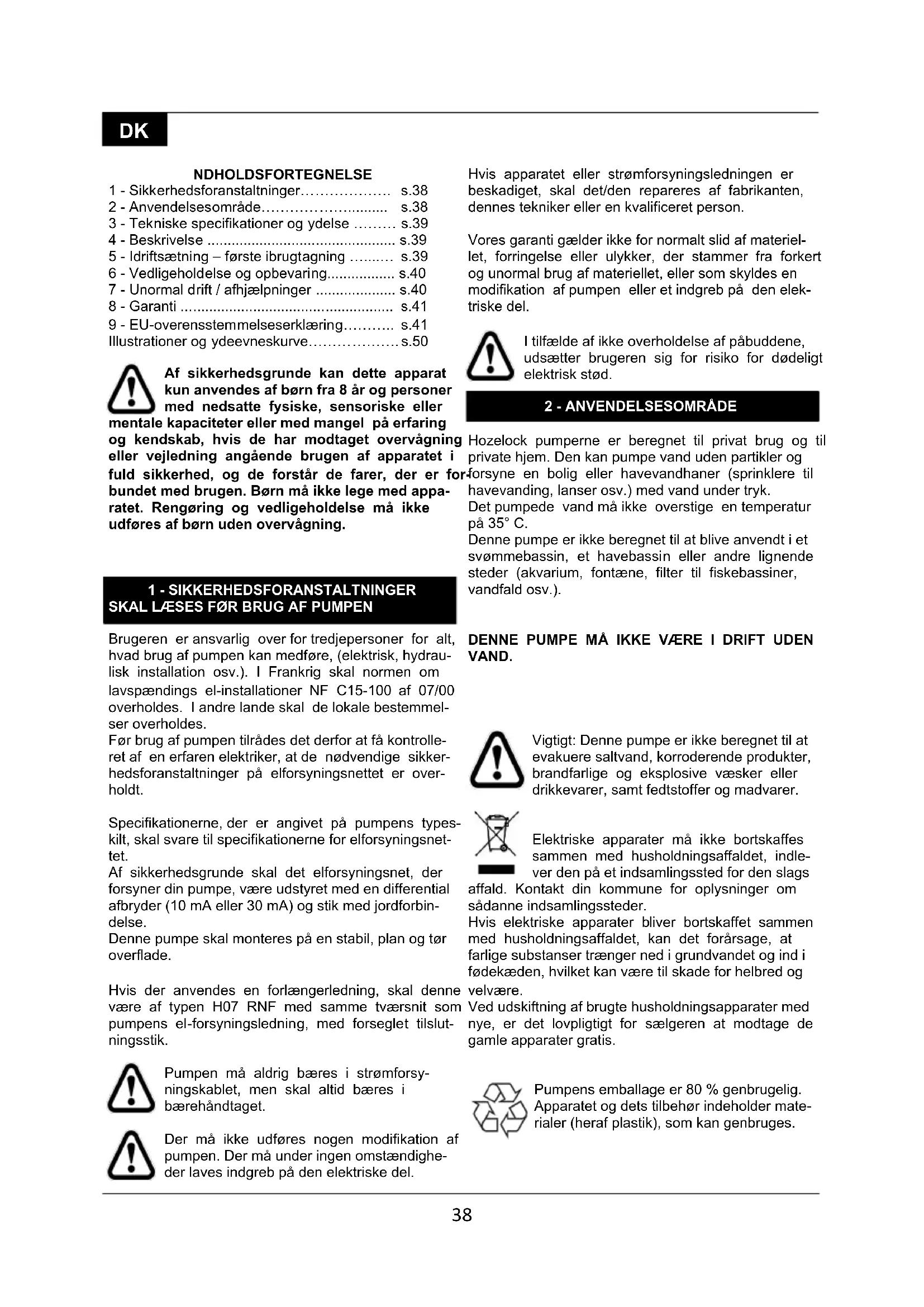 SKAL LÆSES FØR BRUG AF PUMPEN Brugeren er ansvarlig over for tredjepersoner for alt, hvad brug af pumpen kan medføre, (elektrisk, hydrau- lisk installation osv.). I Frankrig skal normen om lavspændings el-installationer NF C15-100 af 07/00 overholdes. I andre lande skal de lokale bestemmel- ser overholdes. Før brug af pumpen tilrådes det derfor at få kontrolle- ret af en erfaren elektriker, at de nødvendige sikker- hedsforanstaltninger på elforsyningsnettet er over- holdt. Specifikationerne, der er angivet på pumpens types- kilt, skal svare til specifikationerne for elforsyningsnet- tet. Af sikkerhedsgrunde skal det elforsyningsnet, der forsyner din pumpe, være udstyret med en differential afbryder (10 mA eller 30 mA) og stik med jordforbin- delse. Denne pumpe skal monteres på en stabil, plan og tør overflade. Hvis der anvendes en forlængerledning, skal denne være af typen H07 RNF med samme tværsnit som pumpens el-forsyningsledning, med forseglet tilslut- ningsstik. Pumpen må aldrig bæres i strømforsy- ningskablet, men skal altid bæres i bærehåndtaget. Der må ikke udføres nogen modifikation af pumpen. Der må under ingen omstændighe- der laves indgreb på den elektriske del. Hvis apparatet eller strømforsyningsledningen er beskadiget, skal det/den repareres af fabrikanten, dennes tekniker eller en kvalificeret person. Vores garanti gælder ikke for normalt slid af materiel- let, forringelse eller ulykker, der stammer fra forkert og unormal brug af materiellet, eller som skyldes en modifikation af pumpen eller et indgreb på den elek- triske del. I tilfælde af ikke overholdelse af påbuddene, udsætter brugeren sig for risiko for dødeligt elektrisk stød.