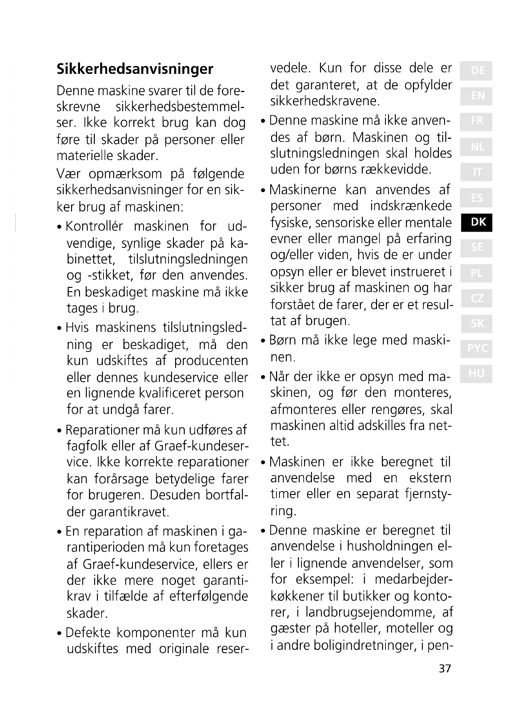 - Giv slædeføringen nogle dråber har- piksfri olie eller vaseline en gang om måneden. Fjern overskydende olie/va- seline med en blød bomuldsklud. Kundeservice Skulle det forekomme, at din Gra- ef-maskine har en skade, skal du kon- takte din specialforhandler eller Gra- ef-kundeservice. Bortskaffelse Når produktets levetid er slut, må det ikke bortskaffes med det normale hus- holdningsaffald, men skal aeveres til et indsamlingssted for genbrug af elek- tronisk husholdningsaffald. Symbolet på produktet og i brugsanvisningen henviser til dette. Materialerne kan genbruges i henhold til mærkningen af dem. Med genbrugen af materialerne eller andre former for genbrug af brug- te maskiner yder du et vigtigt bidrag til beskyttelsen af vores miljø. Spørg kommuneadministrationen efter det pågældende bortskaffelsessted. 2 års motorgaranti For dette produkt giver vi desuden 24 måneders motorgaranti begyndende fra salgsdatoen. Dine lovpligtige ga- rantikrav i henhold til § 439 ff. BGB-E (Tyskland) er ikke berørt af denne ord- ning. Ikke omfattet af garantien er skader, der er opstået på grund af ikke korrekt behandling eller anvendelse, samt mangler, der kun påvirker maski- nens funktion eller værdi ubetydeligt. Desuden er transportskader, for så vidt de ikke er vores ansvarsområde, ude- lukket fra garantikravet. For skader, som opstår på grund af en reparation, der ikke er udført af os eller af en af vores repræsentationer, er garantikrav udelukket. I tilfælde af berettigede re- klamationer vil vi efter vores valg repa- rere den defekte maskine eller udskifte den med et mangelfrit produkt.42 Säkerhetsanvisningar Denna apparat uppfyller kraven i gällande säkerhetsbestämmel- ser. En felaktig användning kan dock leda till personskador och materiella skador. För en säker hantering av appa- raten skall följande säkerhetsan- visningar beaktas.