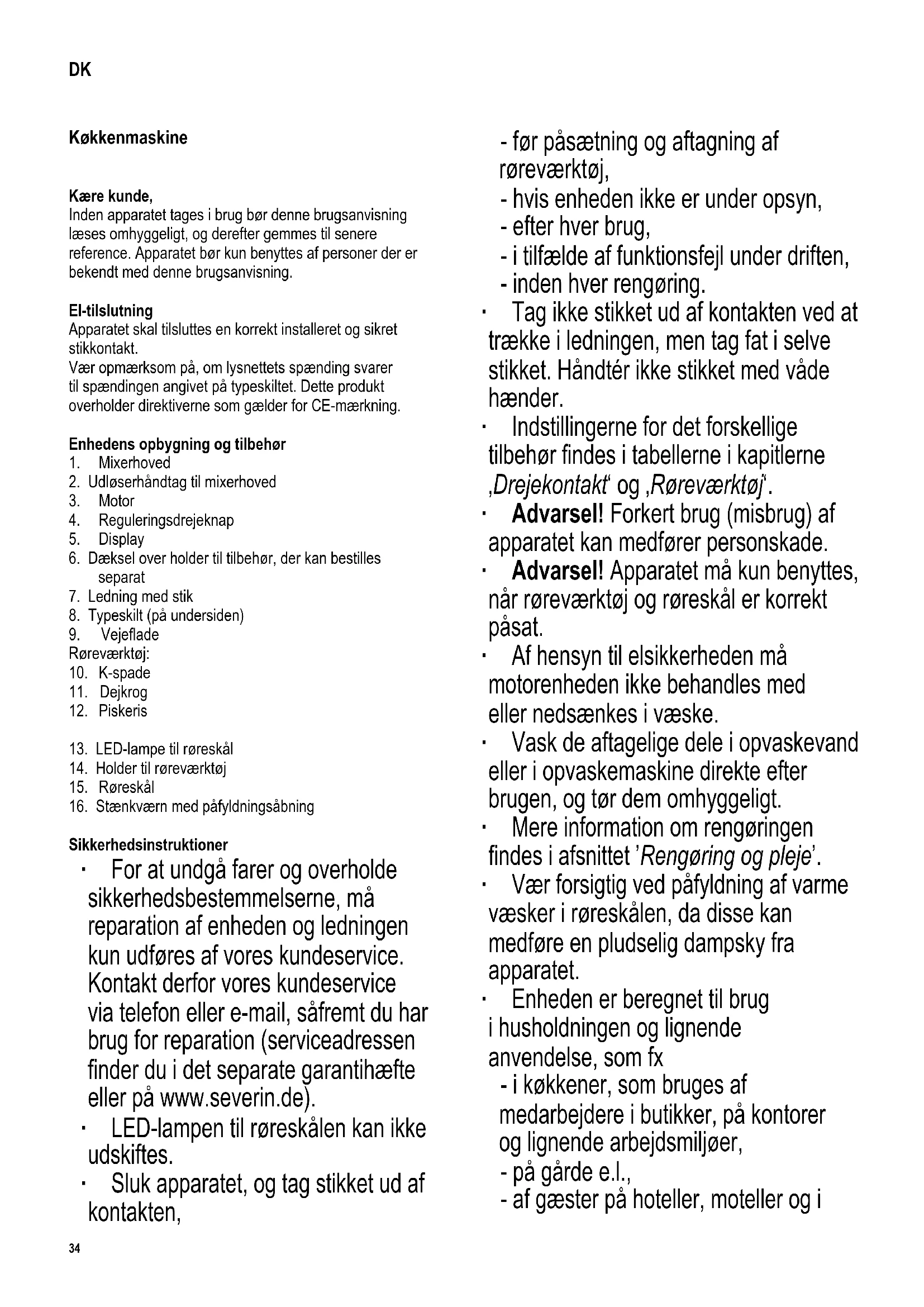 Sikkerhedsinstruktioner ∙ For at undgå farer og overholde sikkerhedsbestemmelserne, må reparation af enheden og ledningen kun udføres af vores kundeservice. Kontakt derfor vores kundeservice via telefon eller e-mail, såfremt du har brug for reparation (serviceadressen nderduidetseparategarantihæfte eller på www.severin.de). ∙ LED-lampen til røreskålen kan ikke udskiftes. ∙ Sluk apparatet, og tag stikket ud af kontakten, - før påsætning og aftagning af røreværktøj, - hvis enheden ikke er under opsyn, - efter hver brug, - i tilfælde af funktionsfejl under driften, - inden hver rengøring. ∙ Tag ikke stikket ud af kontakten ved at trække i ledningen, men tag fat i selve stikket. Håndtér ikke stikket med våde hænder. ∙ Indstillingerne for det forskellige tilbehørndesitabellerneikapitlerne ‚Drejekontakt‘ og ‚Røreværktøj‘. ∙ Advarsel! Forkert brug (misbrug) af apparatet kan medfører personskade. ∙ Advarsel! Apparatet må kun benyttes, når røreværktøj og røreskål er korrekt påsat. ∙ Af hensyn til elsikkerheden må motorenheden ikke behandles med eller nedsænkes i væske. ∙ Vask de aftagelige dele i opvaskevand eller i opvaskemaskine direkte efter brugen, og tør dem omhyggeligt. ∙ Mere information om rengøringen ndesiafsnittet’Rengøring og pleje’. ∙ Vær forsigtig ved påfyldning af varme væsker i røreskålen, da disse kan medføre en pludselig dampsky fra apparatet. ∙ Enheden er beregnet til brug i husholdningen og lignende anvendelse, som fx - i køkkener, som bruges af medarbejdere i butikker, på kontorer og lignende arbejdsmiljøer, - på gårde e.l., - af gæster på hoteller, moteller og i DK35 142 x 208 mm andre typiske boligmiljøer, - i bed and breakfasts. ∙ Enheden må bruges af personer med nedsat fysisk, sensorisk eller mental kapacitet eller manglende erfaring og / eller viden, medmindre de er under opsyn eller er blevet instrueret i sikker brug af enheden og har forstået de deraf følgende farer. ∙ Denne enhed er ikke beregnet til brug af børn. Enheden og dens ledning skal holdes væk fra børn. ∙ Børn må ikke lege med enheden. ∙ Hold børn væk fra emballagematerialerne. Der er risiko for kvælning! ∙ Før du tager enheden i brug, skal du kontrollere hele enheden, inklusive dens ledning og alt tilbehøret, for fejl og skader, der kan forringe dens funktionsdygtighed. Hvis enheden er faldet på gulvet, eller der er trukket i ledningen, kan der forekomme skader, der ikke er synlige udefra. I disse tilfælde, må du ikke bruge enheden. ∙ Stilapparatetpåenstabil,planoverade. ∙ Lad ikke ledningen hænge ned. ∙ Hverken enheden eller ledningen må udsættes for ekstern varme. ∙ Tag aldrig fat i det roterende røreværktøj, og stik aldrig en dejskraber eller ske ned i skålen, mens apparatet kører. ∙ Kontrollér, at drejeknappen står på positionen ‚0‘, inden du sætter stikket i stikkontakten. ∙ Når du slukker apparatet, skal du vente, til motoren er holdt op med at køre, inden du fjerner stænkværnet eller hæver mixerhovedet! Rør ikke ved dele, der stadig er i bevægelse! Anvendelsesformål ∙ Køkkenmaskinen er beregnet til vejning og røring af madvarer og, med brug af de forskellige tilbehørsdele, til miksning og hakning af madvarer. ∙ Vægten er et husholdningsapparat og er derfor ikke egnet til medicinsk eller erhvervsmæssig brug. Apparatet erikkekalibreretefterofcielleretningslinjer. ∙ Vægten har en maksimal bæreevne på op til 7,5 kg. ∙ Apparatet må kun anvendes med originaltilbehøret og til det beskrevne formål. ∙ Hvis apparatet anvendes på anden måde end beskrevet i anvisningerne (fejlanvendelse), anses dette for ukorrekt, og der kan opstå alvorlige personskader eller materielle skader. ∙ Hvis enheden bruges forkert eller til et formål, som den ikke er beregnet til, tages der intet ansvar for eventuelle skader, der måtte opstå. Ekstratilbehør ∙ Køkkenmaskinen kan benyttes med separat indkøbte tilbehørsdele. ∙ Kødhakker ZB 5591 Grøntsagsriver ZB 5592 Blenderindsats ZB 5593 Ekstra røreskål ZB 5595 Pastaværktøj ZB 5594 Aktuelleoplysningeromyderligeretilbehørnderdutil enhver tid på vores hjemmeside. Før den første brug ∙ Pak enheden helt ud, og fjern eventuelle emballagerester og klistermærker. Fjern ikke typeskiltet! ∙ Rengør de aftagelige dele, som beskrevet under ’Rengøring og pleje’. Kortvarig drift Apparatet er beregnet til kortvarig drift (KB 10 min.), dvs. du bør højst benytte det i 10 minutter ad gangen. Herefter skal apparatet slukkes og køle af i 20 minutter. Autosluk ∙ Apparatet slukker automatisk efter 10 minutters drift. Herefter skal det køle af i 20 minutter. ∙ Hvis apparatet ikke benyttes i ca. 2 minutter, slukker displayet. ∙ I det øjeblik, mixerhovedet hæves, slukker apparatet og skal startes igen, når mixerhoved igen sænkes. Overophedningsbeskyttelse Apparatet har en indbygget beskyttelse mod overophedning, der slår det fra ved risiko for overophedning. Lad apparatet køle ned til stuetemperatur, før du igen benytter det.36 142 x 208 mm Lysring og belysning i røreskålen Lysringen om reguleringsdrejeknappen og LED-lampen til røreskålen blinker, mens enheden afventer indtastning. Under miksningen lyser de konstant. Display På displayet vises de valgte funktioner, vægten og varigheden. Desuden kan du vælge varighed og vægtenhed. Symbol Funktion Visning af blandeproces Visning af vejeproces og nulstilling af vægten Visning af restløbetid hhv. varighed for miksningen eller Vægt under vejningen Valg af varighed for mikseproces eller Vælg mellem enhederne kg, g, lb og oz til vejning Drejekontakt Med drejekontakten kan du indstille hastigheden i trin fra 0 til 8 eller vælge pulsfunktionen. Trin Beskrivelse Anvendelse 0 Slukket Før udskiftning af tilbehør, efter brugen 1 Laveste omdrejningstal Til langsom blanding, første blanding af ingredienser, til æltning 2-3 Lavt omdrejn