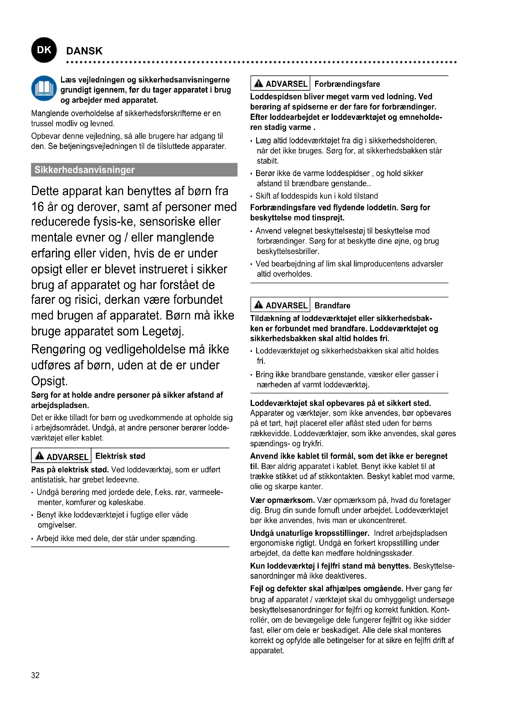 SVENSKA32 Læs vejledningen og sikkerhedsanvisningerne grundigt igennem, før du tager apparatet i brug og arbejder med apparatet. Manglende overholdelse af sikkerhedsforskrifterne er en trussel modliv og levned. Opbevar denne vejledning, så alle brugere har adgang til den. Se betjeningsvejledningen til de tilsluttede apparater. Sikkerhedsanvisninger Dette apparat kan benyttes af børn fra 16 år og derover, samt af personer med reducerede fysis-ke, sensoriske eller mentale evner og / eller manglende erfaring eller viden, hvis de er under opsigt eller er blevet instrueret i sikker brug af apparatet og har forstået de farer og risici, derkan være forbundet med brugen af apparatet. Børn må ikke bruge apparatet som Legetøj. Rengøring og vedligeholdelse må ikke udføres af børn, uden at de er under Opsigt. Sørg for at holde andre personer på sikker afstand af arbejdspladsen. Det er ikke tilladt for børn og uvedkommende at opholde sig i arbejdsområdet. Undgå, at andre personer berører lodde- værktøjet eller kablet. ADVARSEL Elektrisk stød Pas på elektrisk stød. Ved loddeværktøj, som er udført antistatisk, har grebet ledeevne.
