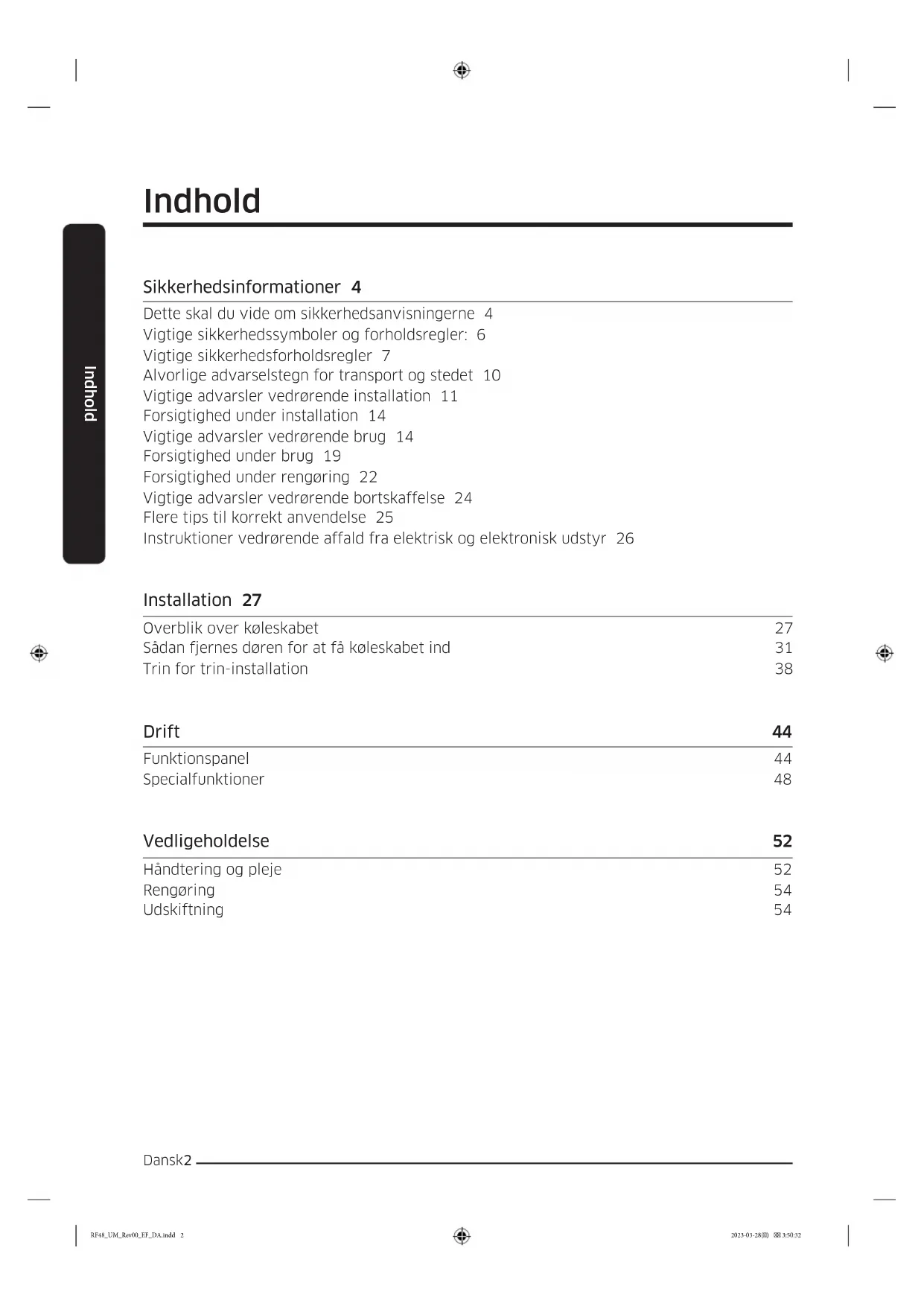 - Dette produkt må kun bruges til opbevaring af fødevarer i private husholdninger. RF48_UM_Rev00_EF_DA.indd 17 2023-03-28() 3:50:33Sikkerhedsinformationer Sikkerhedsinformationer Dansk18