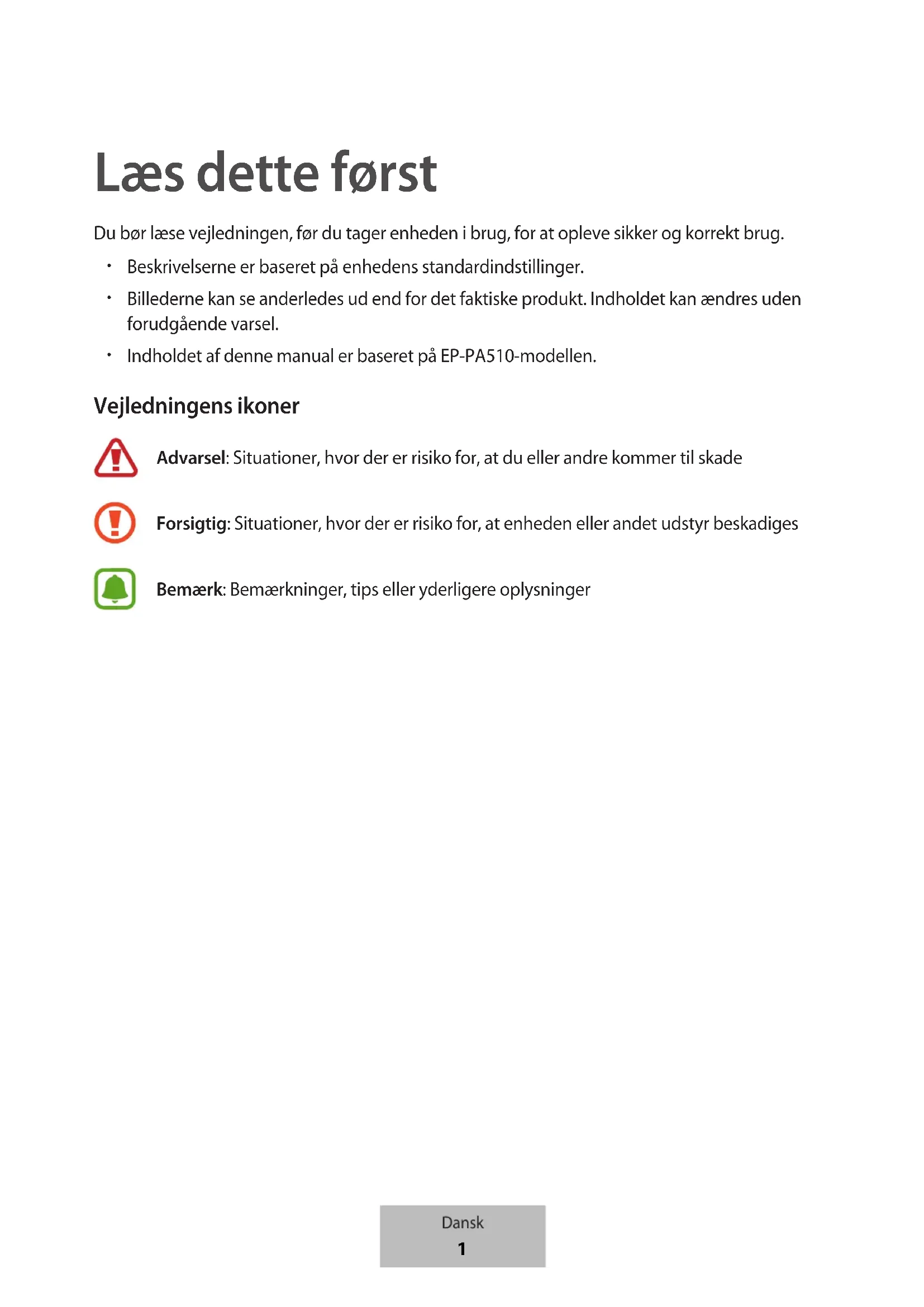 Læs dette først Du bør læse vejledningen, før du tager enheden i brug, for at opleve sikker og korrekt brug.