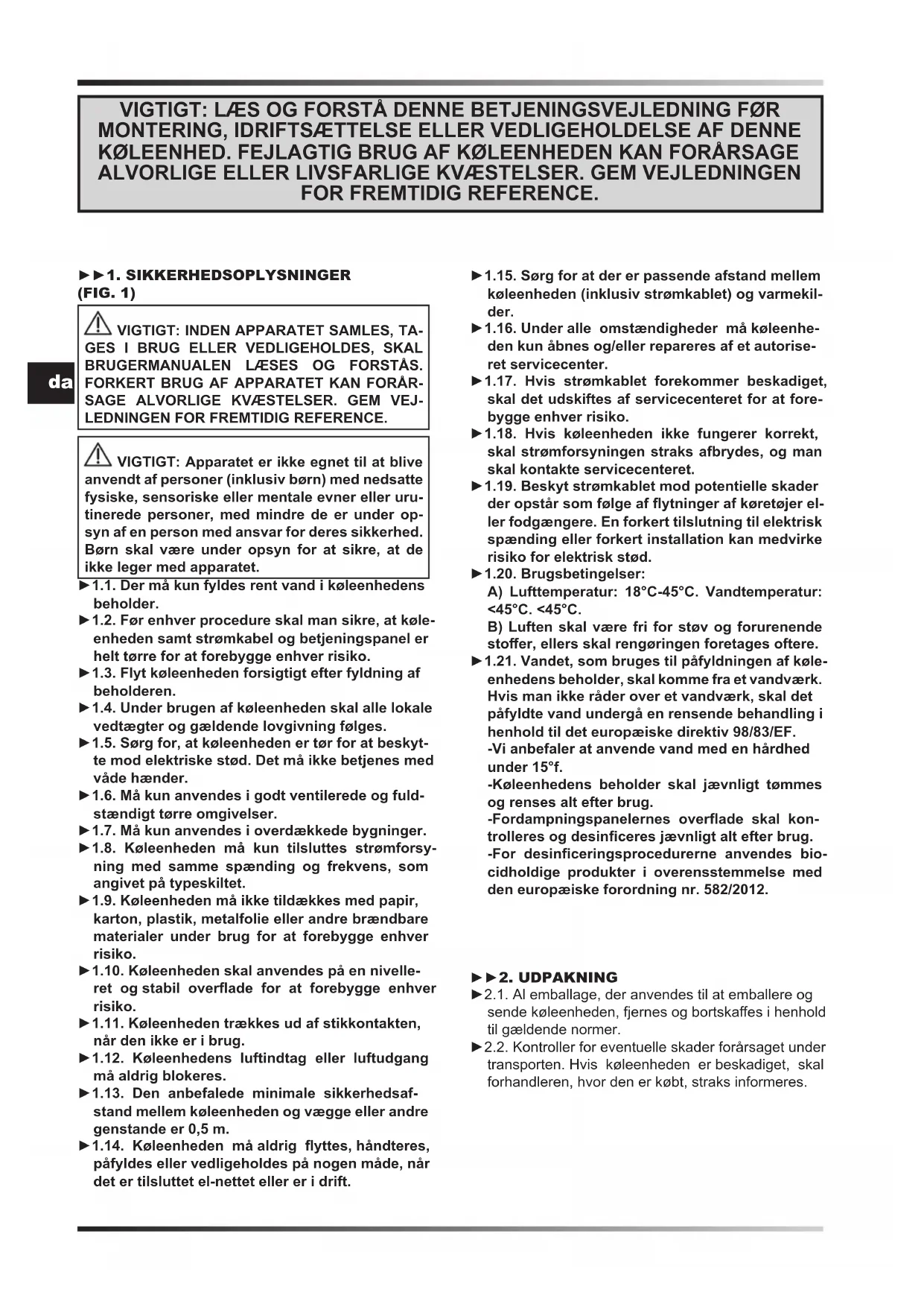 LEDNINGEN FOR FREMTIDIG REFERENCE. VIGTIGT: Apparatet er ikke egnet til at blive anvendt af personer (inklusiv børn) med nedsatte fysiske, sensoriske eller mentale evner eller uru- tinerede personer, med mindre de er under op- syn af en person med ansvar for deres sikkerhed. Børn skal være under opsyn for at sikre, at de ikke leger med apparatet. ►1.1. Der må kun fyldes rent vand i køleenhedens beholder. ►1.2. Før enhver procedure skal man sikre, at køle- enheden samt strømkabel og betjeningspanel er helt tørre for at forebygge enhver risiko. ►1.3. Flyt køleenheden forsigtigt efter fyldning af beholderen. ►1.4. Under brugen af køleenheden skal alle lokale vedtægter og gældende lovgivning følges. ►1.5. Sørg for, at køleenheden er tør for at beskyt- te mod elektriske stød. Det må ikke betjenes med våde hænder. ►1.6. Må kun anvendes i godt ventilerede og fuld- stændigt tørre omgivelser. ►1.7. Må kun anvendes i overdækkede bygninger. ►1.8. Køleenheden må kun tilsluttes strømforsy- ning med samme spænding og frekvens, som angivet på typeskiltet. ►1.9. Køleenheden må ikke tildækkes med papir, karton, plastik, metalfolie eller andre brændbare materialer under brug for at forebygge enhver risiko. ►1.10. Køleenheden skal anvendes på en nivelle- ret og stabil overade for at forebygge enhver risiko. ►1.11. Køleenheden trækkes ud af stikkontakten, når den ikke er i brug. ►1.12. Køleenhedens luftindtag eller luftudgang må aldrig blokeres. ►1.13. Den anbefalede minimale sikkerhedsaf- stand mellem køleenheden og vægge eller andre genstande er 0,5 m. ►1.14. Køleenheden må aldrig yttes, håndteres, påfyldes eller vedligeholdes på nogen måde, når det er tilsluttet el-nettet eller er i drift. ►1.15. Sørg for at der er passende afstand mellem køleenheden (inklusiv strømkablet) og varmekil- der. ►1.16. Under alle omstændigheder må køleenhe- den kun åbnes og/eller repareres af et autorise- ret servicecenter. ►1.17. Hvis strømkablet forekommer beskadiget, skal det udskiftes af servicecenteret for at fore- bygge enhver risiko. ►1.18. Hvis køleenheden ikke fungerer korrekt, skal strømforsyningen straks afbrydes, og man skal kontakte servicecenteret. ►1.19. Beskyt strømkablet mod potentielle skader der opstår som følge af ytninger af køretøjer el- ler fodgængere. En forkert tilslutning til elektrisk spænding eller forkert installation kan medvirke risiko for elektrisk stød. ►1.20. Brugsbetingelser: A) Lufttemperatur: 18°C-45°C. Vandtemperatur: <45°C. <45°C. B) Luften skal være fri for støv og forurenende stoer, ellers skal rengøringen foretages oftere. ►1.21. Vandet, som bruges til påfyldningen af køle- enhedens beholder, skal komme fra et vandværk. Hvis man ikke råder over et vandværk, skal det påfyldte vand undergå en rensende behandling i henhold til det europæiske direktiv 98/83/EF. -Vi anbefaler at anvende vand med en hårdhed under 15°f. -Køleenhedens beholder skal jævnligt tømmes og renses alt efter brug. -Fordampningspanelernes overade skal kon- trolleres og desinceres jævnligt alt efter brug. -For desinceringsprocedurerne anvendes bio- cidholdige produkter i overensstemmelse med den europæiske forordning nr. 582/2012. ►►2. UDPAKNING ►2.1. Al emballage, der anvendes til at emballere og sende køleenheden, fjernes og bortskaes i henhold til gældende normer. ►2.2. Kontroller for eventuelle skader forårsaget under transporten. Hvis køleenheden er beskadiget, skal forhandleren, hvor den er købt, straks informeres. VIGTIGT: LÆS OG FORSTÅ DENNE BETJENINGSVEJLEDNING FØR MONTERING, IDRIFTSÆTTELSE ELLER VEDLIGEHOLDELSE AF DENNE KØLEENHED. FEJLAGTIG BRUG AF KØLEENHEDEN KAN FORÅRSAGE ALVORLIGE ELLER LIVSFARLIGE KVÆSTELSER. GEM VEJLEDNINGEN FOR FREMTIDIG REFERENCE.da ►►3. BESKRIVELSE (FIG. 2) Fordampningskøleenhederne afkøler luften ved at be- nytte den naturlige proces i fordampningen af vandet. De grundlæggende principper for denne form for luft- køleenhed er fordampningsafkøling, der udnytter ener- giudvekslingen mellem vand og luft. Køleenhederne består af et fordampningspanel, en ventilator og et gennemløbssystem til fordeling af van- det. Ventilatoren suger vand udefra og lader det strøm- me igennem fordampningspanelet, der udelukkende består af cellulose og holdes fugtigt konstant af et sy- stem, der pumper vand. ►►4. BRUG