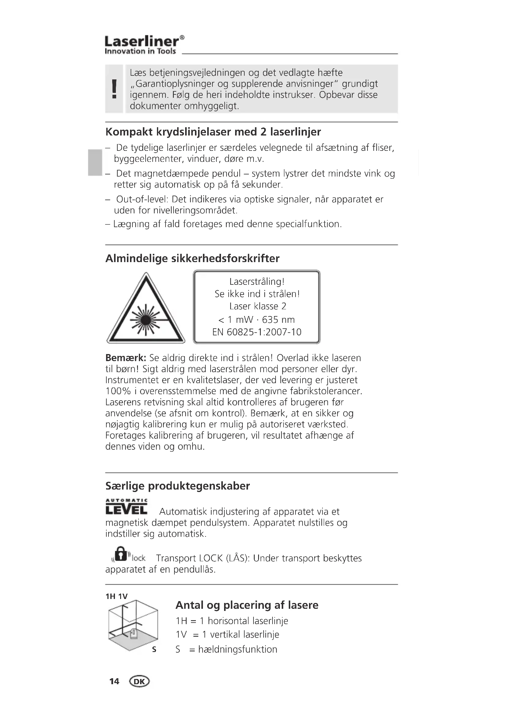 5 mm / 10 m 20 m 635 nm 2 / < 1 mW 1 x 1,5V alkalisk batteri (type AA, LR6) / 5 time 0°C ... +50°C -10°C ... + 70°C 35 x 153 x 36 mm 0,13 kg Selvnivelleringsområde Nøjagtighed Rækkevidde (afhængig af lysforhold) Laserbølgelængde Laserklasse / udgangseffekt linjelaser Strømforsyning / Drifttid Arbejdstemperatur Opbevaringstemperatur Mål (b x h x l) Vægt (inkl. batterier) Forbehold for tekniske ændringer 02.2010. Flere sikkerhedsanvisninger og supplerende tips på: www.laserliner.com/info