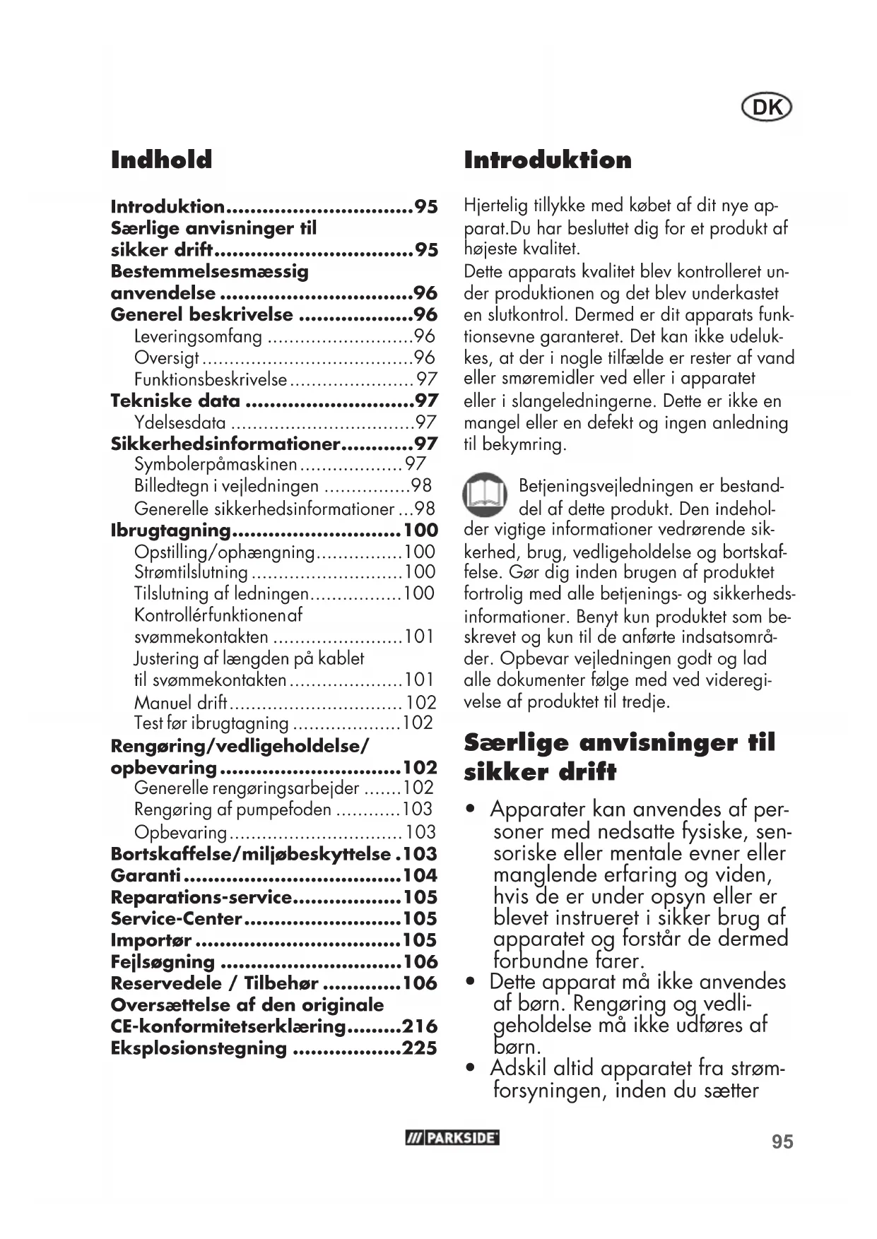 - Se de øvrige anvisninger i ka- pitlet „Rengøring/vedligeholdel- se/ opbevaring“. Bestemmelsesmæssig anvendelse Spildevands-dykpumpen (efterfølgende be- tegnet som pumpe) er en dræningspumpe og beregnet til pumpning af vand og spild- evand (maks. partikelstørrelse 35 mm) op til en temperatur på maks. 35 °C. Den er f.eks. egnet til at tømme eller trans- portere vand fra bassiner og beholdere, til tømning af oversvømmede kældre og til vandudtag fra brønde og skakter. Dette apparat er ikke egnet til erhvervs- mæssig brug. Ved erhvervsmæssig brug bortfalder garantien. Enhver anden anvendelse, som ikke er udtrykkeligt tilladt i denne betjeningsvejled- ning, kan forårsage skader ved apparatet og udgøre en alvorlig fare for brugeren. Pumpen er ikke beregnet til kontinuerlig drift, og vi påtager os ingen garanti herfor. Brugeren er ansvarlig for ulykker eller skader på andre mennesker eller disses ejendom. Producenten er ikke ansvarlig for skader, som skyldes ikke-formålsbestemt anvendel- se, eller som skyldes forkert betjening.97