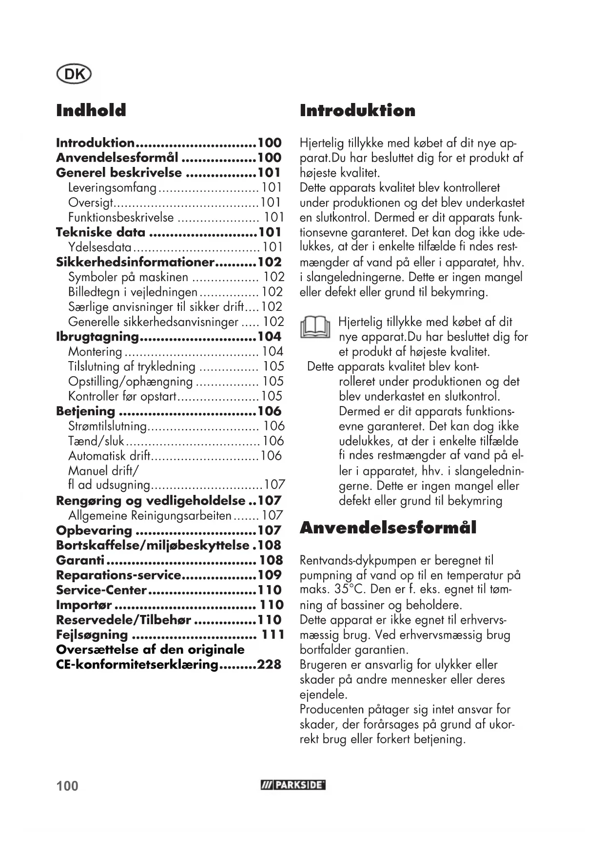 - Introduktion Hjertelig tillykke med købet af dit nye ap- parat.Du har besluttet dig for et produkt af højeste kvalitet. Dette apparats kvalitet blev kontrolleret under produktionen og det blev underkastet en slutkontrol. Dermed er dit apparats funk- tionsevne garanteret. Det kan dog ikke ude- lukkes, at der i enkelte tilfælde ndes rest- mængder af vand på eller i apparatet, hhv. i slangeledningerne. Dette er ingen mangel eller defekt eller grund til bekymring. Hjertelig tillykke med købet af dit nye apparat.Du har besluttet dig for et produkt af højeste kvalitet. Dette apparats kvalitet blev kont- rolleret under produktionen og det blev underkastet en slutkontrol. Dermed er dit apparats funktions- evne garanteret. Det kan dog ikke udelukkes, at der i enkelte tilfælde ndes restmængder af vand på el- ler i apparatet, hhv. i slangelednin- gerne. Dette er ingen mangel eller defekt eller grund til bekymring Anvendelsesformål Rentvands-dykpumpen er beregnet til pumpning af vand op til en temperatur på maks. 35°C. Den er f. eks. egnet til tøm- ning af bassiner og beholdere. Dette apparat er ikke egnet til erhvervs- mæssig brug. Ved erhvervsmæssig brug bortfalder garantien. Brugeren er ansvarlig for ulykker eller skader på andre mennesker eller deres ejendele. Producenten påtager sig intet ansvar for skader, der forårsages på grund af ukor- rekt brug eller forkert betjening. Indhold Introduktion p. 100