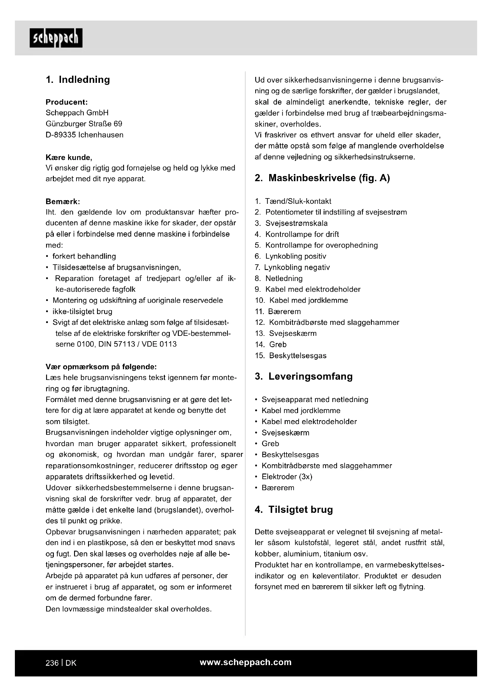 - Svigt af det elektriske anlæg som følge af tilsidesæt- telse af de elektriske forskrifter og VDE-bestemmel- serne 0100, DIN 57113 / VDE 0113 Vær opmærksom på følgende: Læs hele brugsanvisningens tekst igennem før monte- ring og før ibrugtagning. Formålet med denne brugsanvisning er at gøre det let- tere for dig at lære apparatet at kende og benytte det som tilsigtet. Brugsanvisningen indeholder vigtige oplysninger om, hvordan man bruger apparatet sikkert, professionelt og økonomisk, og hvordan man undgår farer, sparer reparationsomkostninger, reducerer driftsstop og øger apparatets driftssikkerhed og levetid. Udover sikkerhedsbestemmelserne i denne brugsan- visning skal de forskrifter vedr. brug af apparatet, der måtte gælde i det enkelte land (brugslandet), overhol- des til punkt og prikke. Opbevar brugsanvisningen i nærheden apparatet; pak den ind i en plastikpose, så den er beskyttet mod snavs og fugt. Den skal læses og overholdes nøje af alle be- tjeningspersoner, før arbejdet startes. Arbejde på apparatet på kun udføres af personer, der er instrueret i brug af apparatet, og som er informeret om de dermed forbundne farer. Den lovmæssige mindstealder skal overholdes.www.scheppach.com