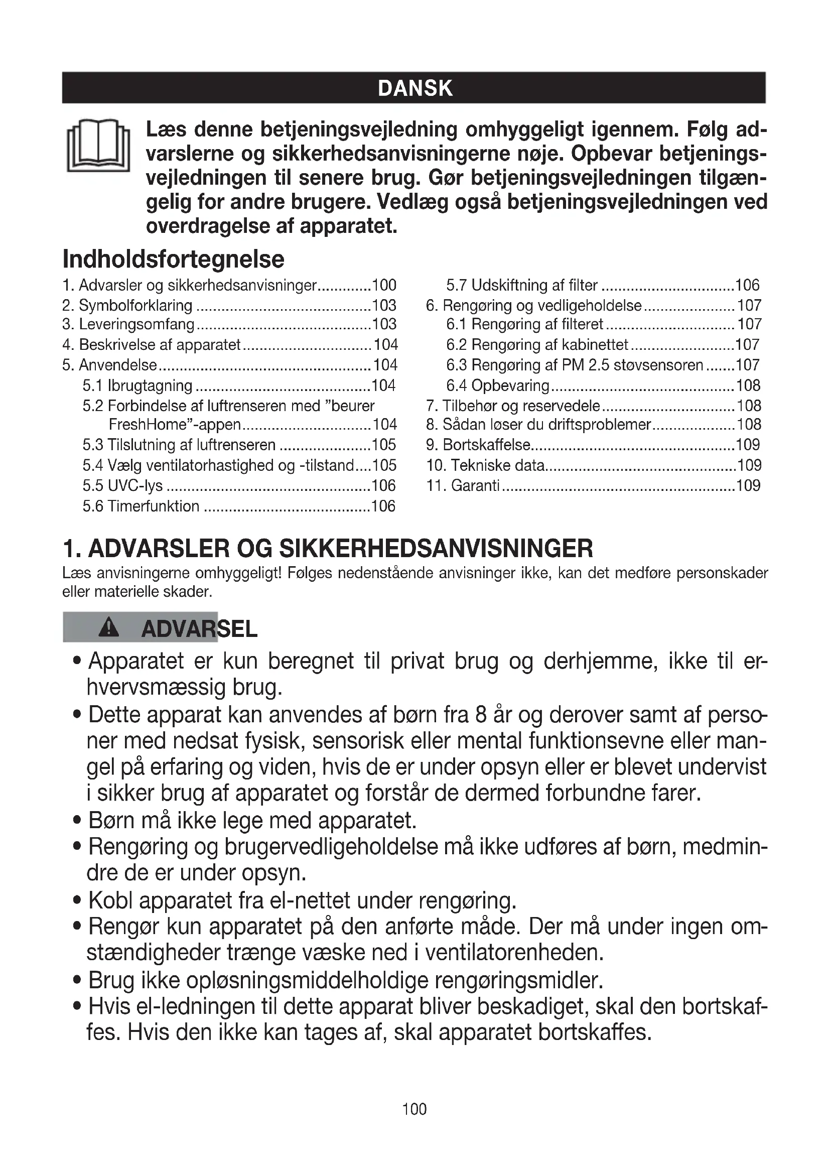 Tilsigtet brug Denne luftrenser er udelukkende beregnet til rensning af luften indendørs. Brug kun apparatet til det formål, det er udviklet til, og kun på den måde, som er angivet i betjeningsvej