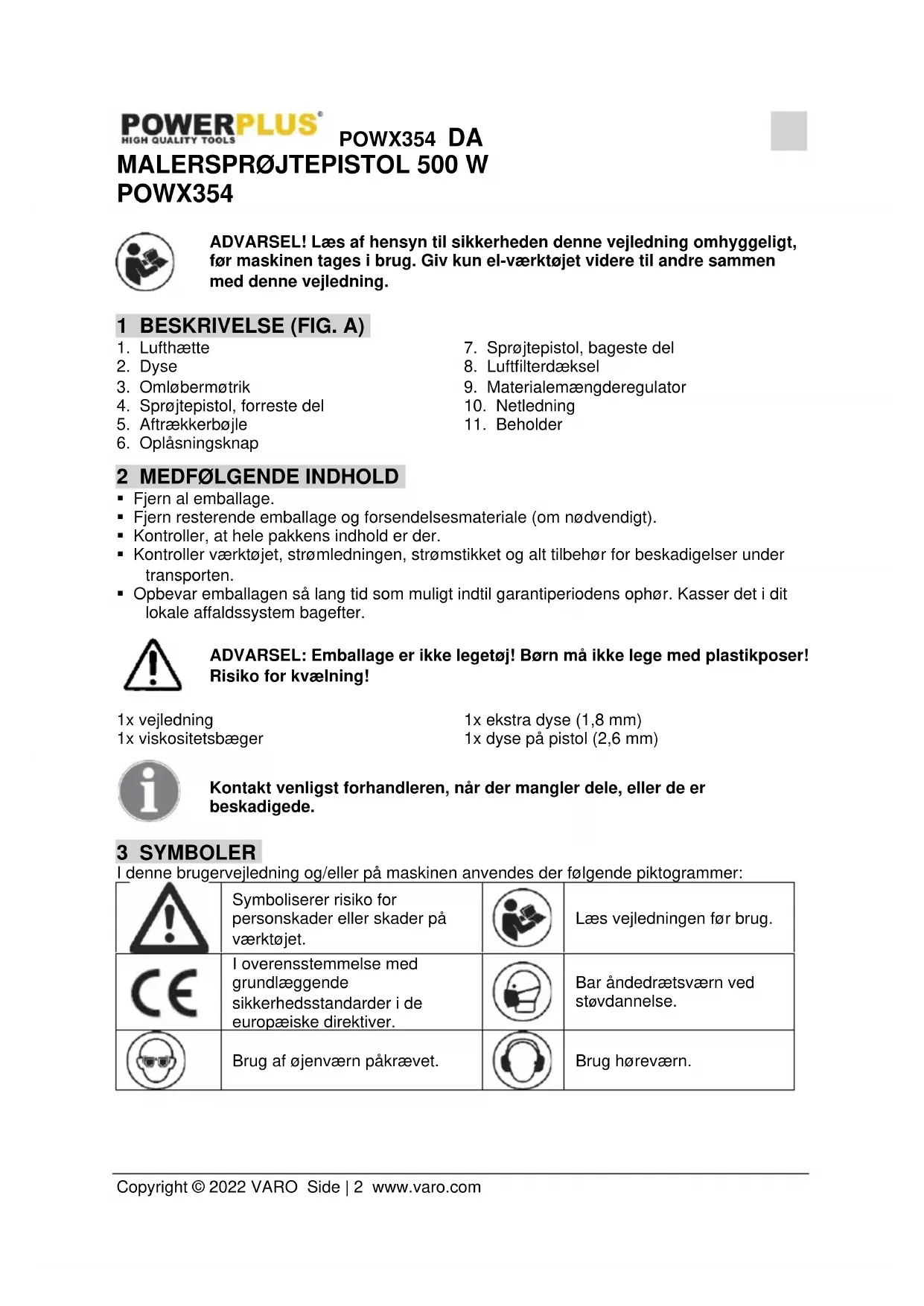 - Det samlede værktøj skal returneres til forhandleren i rimelig ren stand, i den originale blæseformede æske (hvis relevant for enheden) sammen med købsdokumentation. 12 MILJØ Hvis maskinen skal skiftes ud efter lang tids brug, må den ikke bortskaffes som husholdningsaffald, men skal bortskaffes på en miljømæssigt forsvarlig måde. Affald produceret af de elektriske maskiner må ikke behandles som normalt husaffald. Sørg for at genbruge det, hvor der findes egnede anlæg til det. Kontakt den lokale instans eller forhandleren for at få rådgivning om indsamling og bortskaffelse.POWX354 DA Copyright © 2022 VARO Side | 11 www.varo.com 13 KONFORMITETSERKLÆRING VARO N.V. – Vic. Van Rompuy N.V. Joseph Van Instraat 9 – BE2500 Lier – Belgien, erklærer hermed som eneansvarlig, at Apparatbeskrivelse: MALERSPRØJTEPISTOL 500 W Varemærke: POWERplus Varenummer: POWX354 er i overensstemmelse med de væsentlige krav og andre relevante bestemmelser i gældende europæiske direktiver, der er baseret på anvendelse af europæiske harmoniserede standarder. Enhver uautoriseret modifikation af apparatet ugyldiggør denne erklæring. EU-direktiver (herunder eventuelle tillæg): 2006/42/EC 2014/30/EU 2011/65/EU Europæiske harmoniserede standarder (herunder eventuelle tillæg): EN60745-1 : 2009 EN50580 : 2012