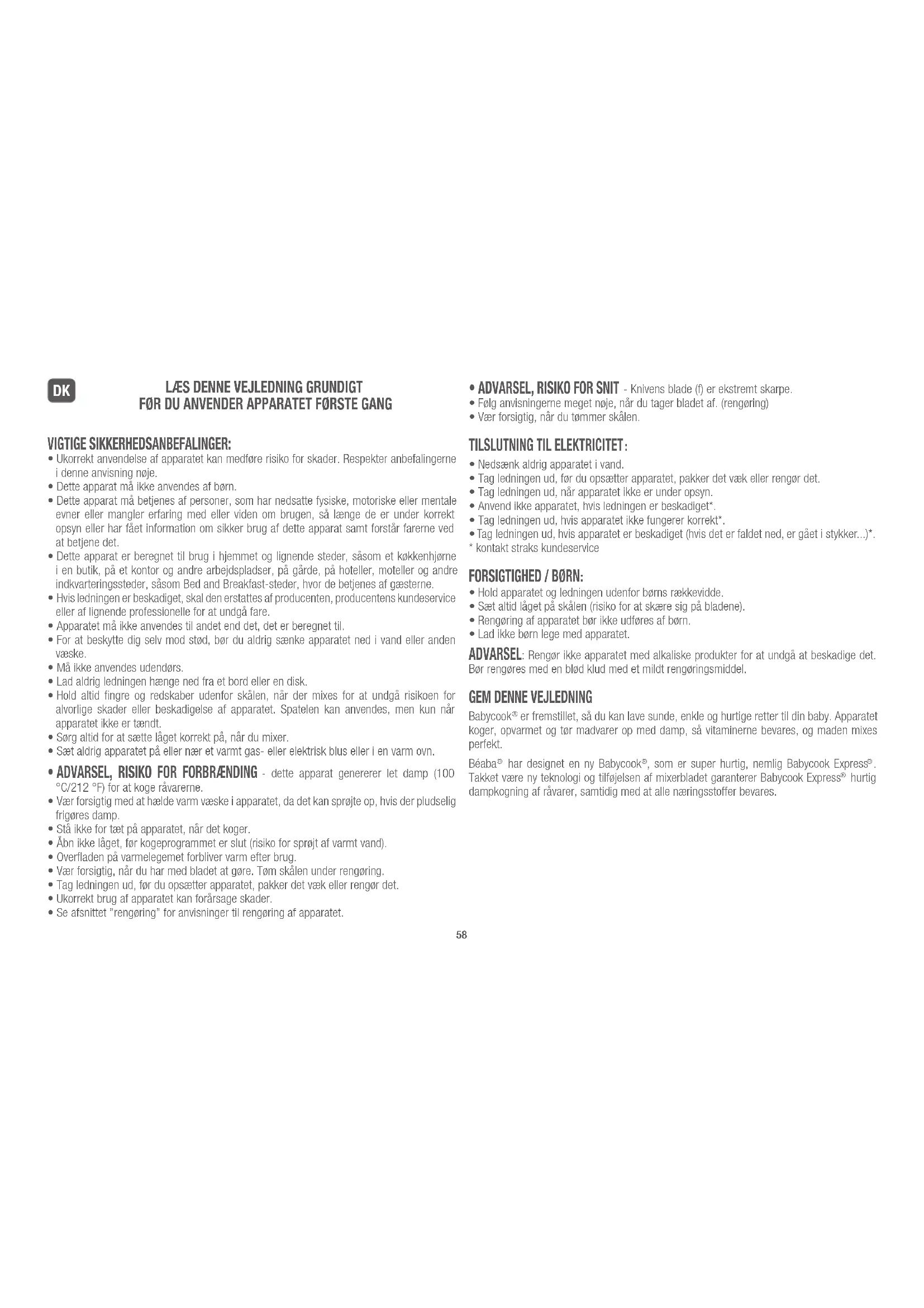 - Ukorrekt anvendelse af apparatet kan medføre risiko for skader. Respekter anbefalingerne i denne anvisning nøje.