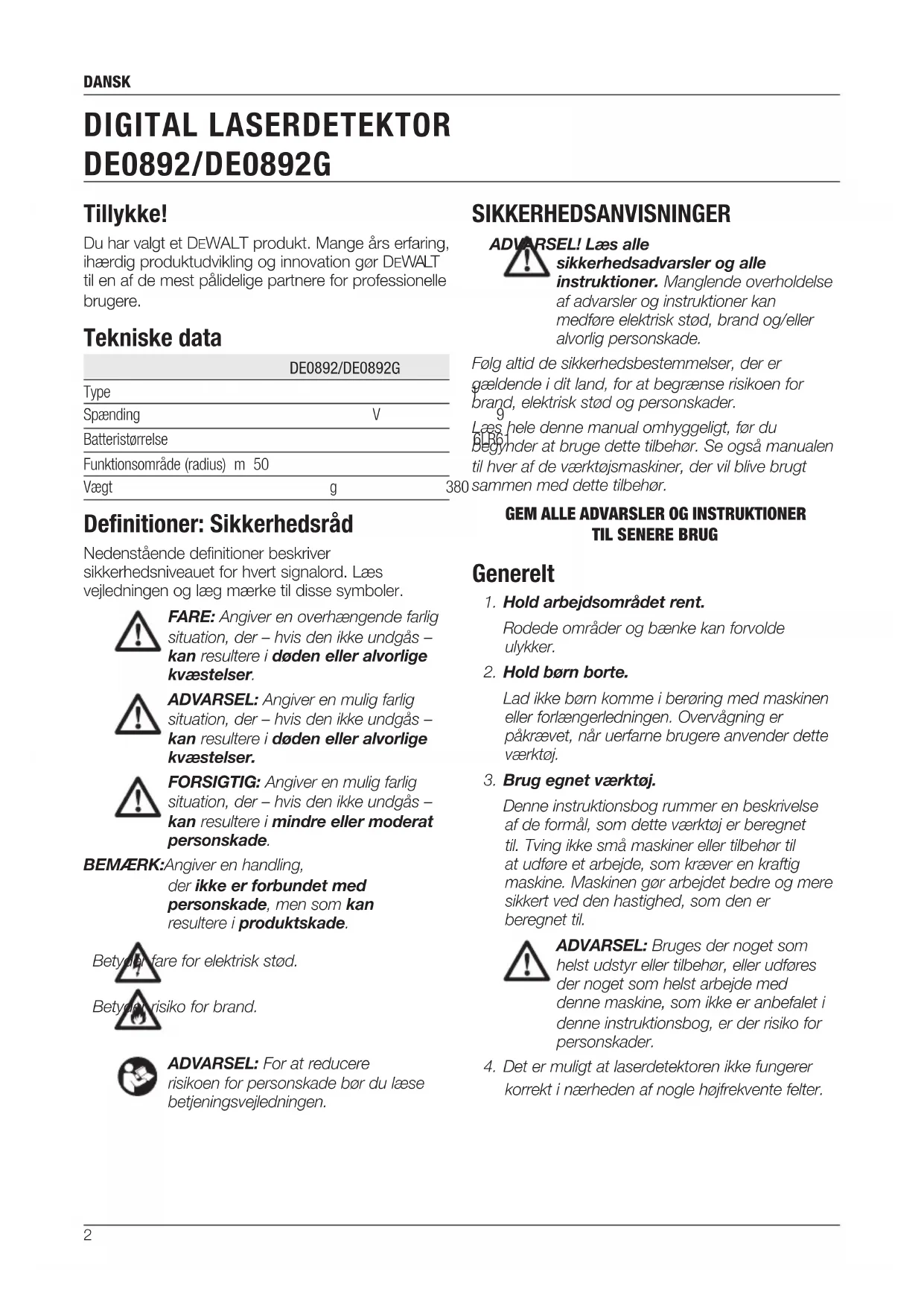 Tillykke! Du har valgt et DeWALT produkt. Mange års erfaring, ihærdig produktudvikling og innovation gør DeWALT til en af de mest pålidelige partnere for professionelle brugere. Tekniske data DE0892/DE0892G Type 1 Spænding V 9 Batteristørrelse 6LR61 Funktionsområde (radius) m 50 Vægt g 380 Definitioner: Sikkerhedsråd Nedenstående definitioner beskriver sikkerhedsniveauet for hvert signalord. Læs vejledningen og læg mærke til disse symboler. FARE: Angiver en overhængende farlig situation, der – hvis den ikke undgås – kan resultere i døden eller alvorlige kvæstelser. ADVARSEL: Angiver en mulig farlig situation, der – hvis den ikke undgås – kan resultere i døden eller alvorlige kvæstelser. FORSIGTIG: Angiver en mulig farlig situation, der – hvis den ikke undgås – kan resultere i mindre eller moderat personskade. BEMÆRK: Angiver en handling, der ikke er forbundet med personskade, men som kan resultere i produktskade. Betyder fare for elektrisk stød. Betyder risiko for brand. ADVARSEL: For at reducere risikoen for personskade bør du læse betjeningsvejledningen. DIGITAL LASERDETEKTOR DE0892/DE0892G SIKKERHEDSANVISNINGER ADVARSEL! Læs alle sikkerhedsadvarsler og alle instruktioner. Manglende overholdelse af advarsler og instruktioner kan medføre elektrisk stød, brand og/eller alvorlig personskade. Følg altid de sikkerhedsbestemmelser, der er gældende i dit land, for at begrænse risikoen for brand, elektrisk stød og personskader. Læs hele denne manual omhyggeligt, før du begynder at bruge dette tilbehør. Se også manualen til hver af de værktøjsmaskiner, der vil blive brugt sammen med dette tilbehør.