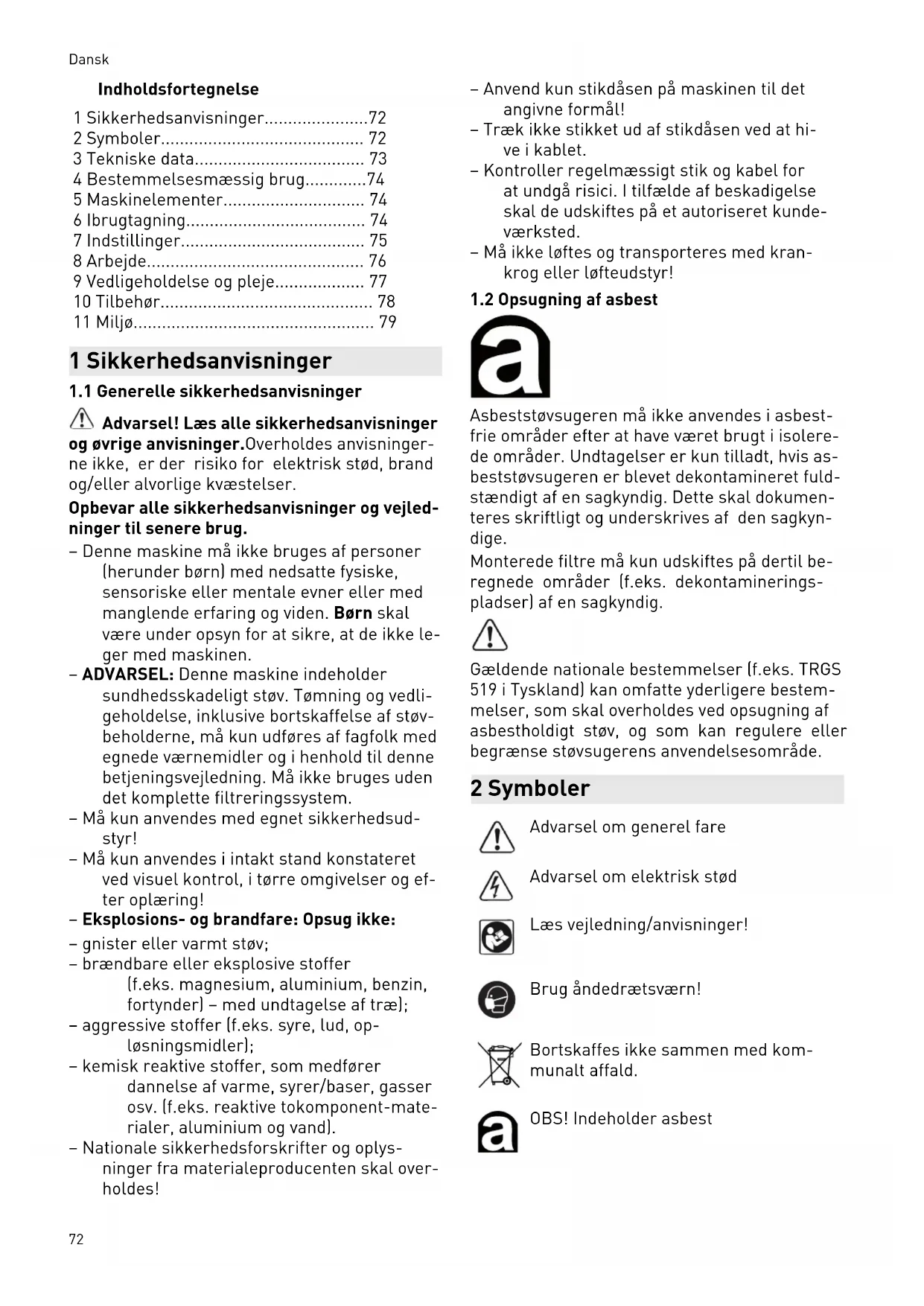 Asbeststøvsugeren må ikke anvendes i asbest frie områder efter at have været brugt i isolere de områder. Undtagelser er kun tilladt, hvis as beststøvsugeren er blevet dekontamineret fuld stændigt af en sagkyndig. Dette skal dokumen teres skriftligt og underskrives af den sagkyn dige. Monterede filtre må kun udskiftes på dertil be regnede områder (f.eks. dekontaminerings pladser) af en sagkyndig. Gældende nationale bestemmelser (f.eks. TRGS 519 i Tyskland) kan omfatte yderligere bestem melser, som skal overholdes ved opsugning af asbestholdigt støv, og som kan regulere eller begrænse støvsugerens anvendelsesområde. 2 Symboler Advarsel om generel fare Advarsel om elektrisk stød Læs vejledning/anvisninger! Brug åndedrætsværn! Bortskaffes ikke sammen med kom munalt affald. OBS! Indeholder asbest Dansk 72Stikdåse med startautomatik WARNUNG ≤ 0,1 mg/m