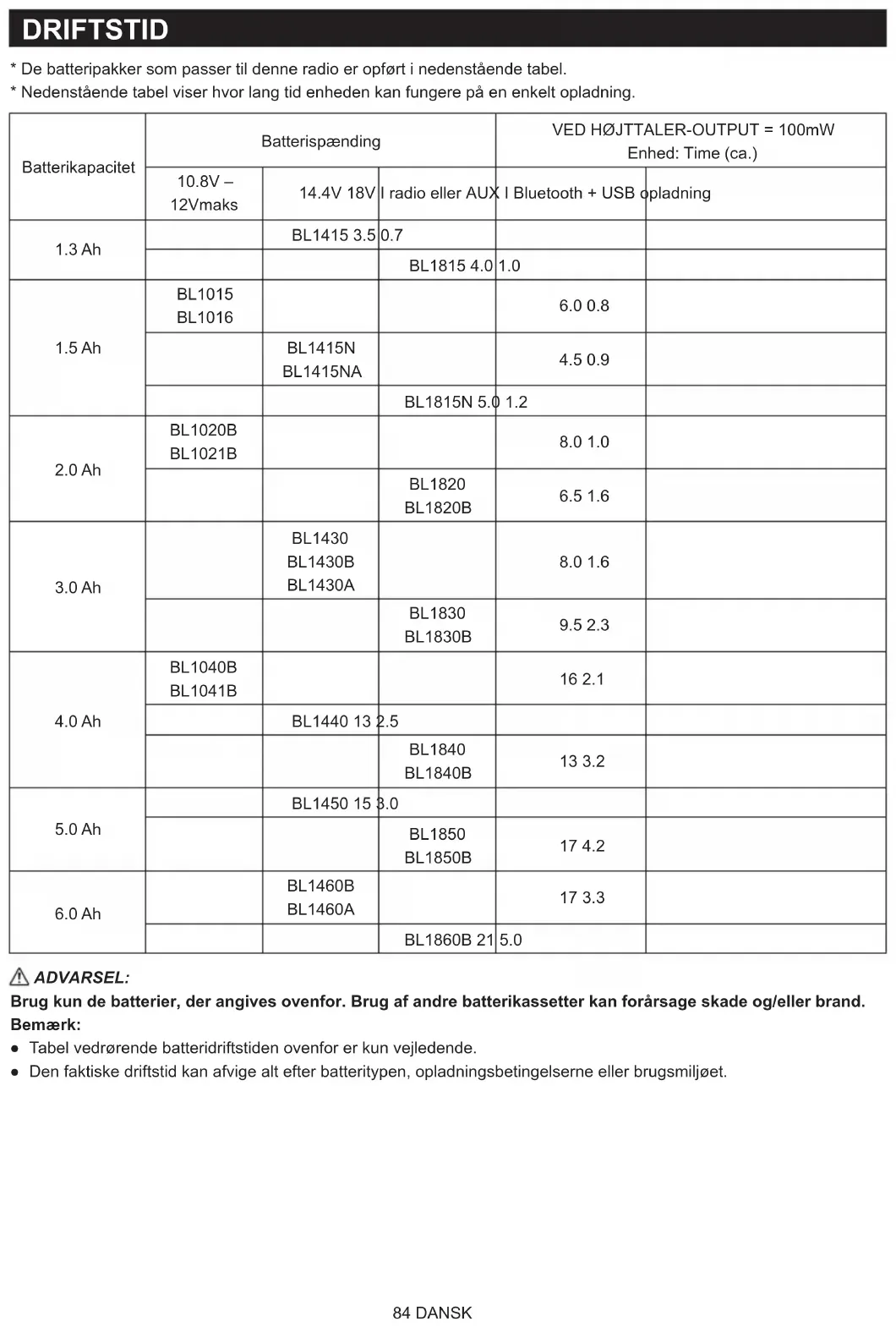 BL1860B 21 5.0 ADVARSEL: Brug kun de batterier, der angives ovenfor. Brug af andre batterikassetter kan forårsage skade og/eller brand. Bemærk: ● Tabel vedrørende batteridriftstiden ovenfor er kun vejledende. ● Den faktiske driftstid kan afvige alt efter batteritypen, opladningsbetingelserne eller brugsmiljøet.85 DANSK INSTALLATION OG STRØMFORSYNING ADVARSEL: