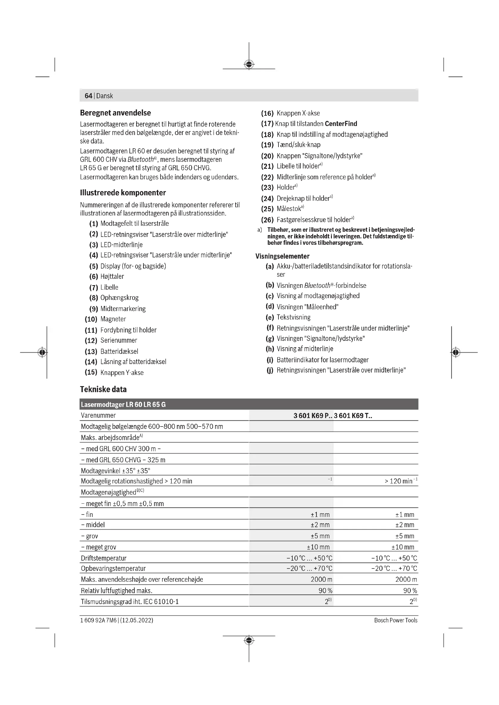Tilbehør, som er illustreret og beskrevet i betjeningsvejled- ningen, er ikke indeholdt i leveringen. Det fuldstændige til- behør findes i vores tilbehørsprogram. Visningselementer (a) Akku-/batteriladetilstandsindikator for rotationsla- ser (b) Visningen Bluetooth®-forbindelse (c) Visning af modtagenøjagtighed (d) Visningen "Måleenhed" (e) Tekstvisning (f) Retningsvisningen "Laserstråle under midterlinje" (g) Visningen "Signaltone/lydstyrke" (h) Visning af midterlinje (i) Batteriindikator for lasermodtager (j) Retningsvisningen "Laserstråle over midterlinje" Tekniske data Lasermodtager LR60 LR 65G Varenummer 3601K69P.. 3601K69T.. Modtagelig bølgelængde 600–800nm 500–570nm Maks. arbejdsområde