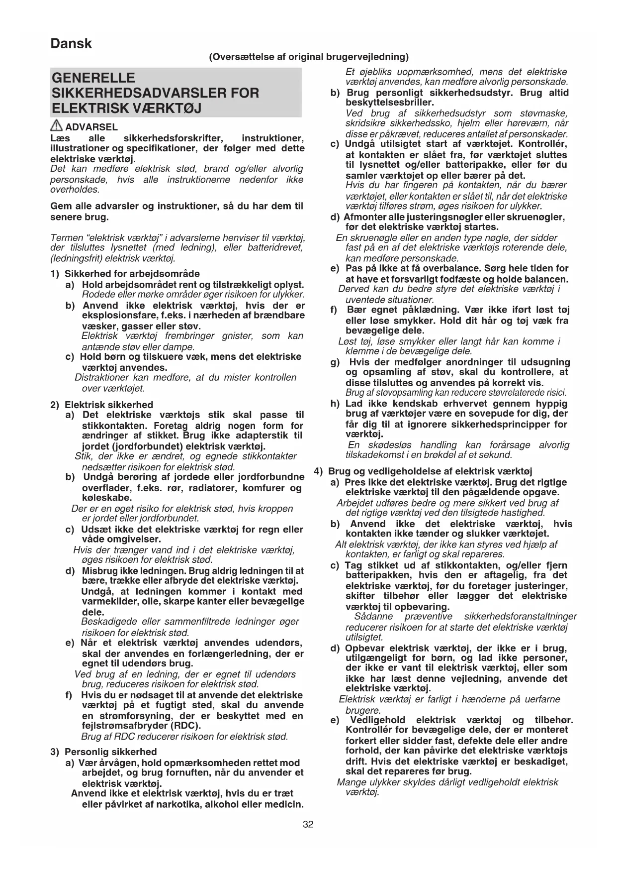 4) Brug og vedligeholdelse af elektrisk værktøj