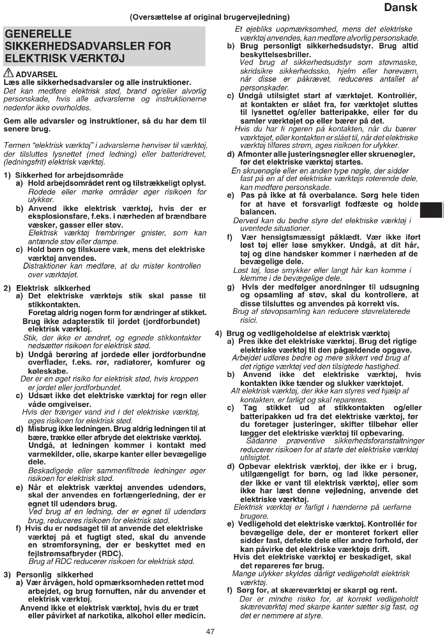 ADVARSEL Læs alle sikkerhedsadvarsler og alle instruktioner. Det kan medføre elektrisk stød, brand og/eller alvorlig personskade, hvis alle advarslerne og instruktionerne nedenfor ikke overholdes. Gem alle advarsler og instruktioner, så du har dem til senere brug. Termen “elektrisk værktøj” i advarslerne henviser til værktøj, der tilsluttes lysnettet (med ledning) eller batteridrevet, (ledningsfrit) elektrisk værktøj.