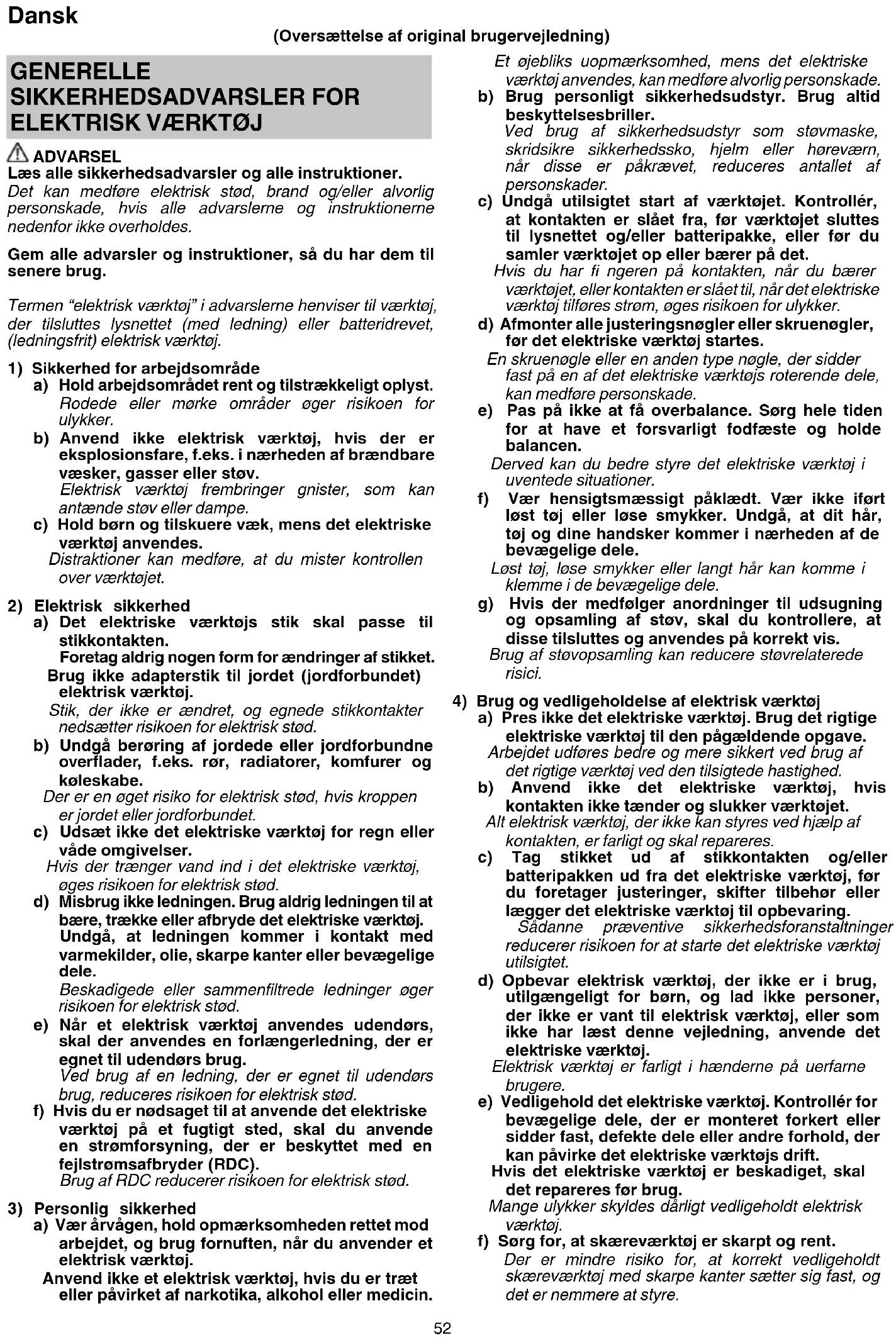 a) Vær årvågen, hold opmærksomheden rettet mod arbejdet, og brug fornuften, når du anvender et elektrisk værktøj. Anvend ikke et elektrisk værktøj, hvis du er træt eller påvirket af narkotika, alkohol eller medicin. (Oversættelse af original brugervejledning) 0000BookG12VA.indb520000BookG12VA.indb52 2017/11/2912:09:242017/11/2912:09:2453 Dansk g) Brug det elektriske værktøj, tilbehør og bits osv. i overensstemmelse med denne vejledning under hensynstagen til arbejdsforholdene og det arbejde, der skal udføres. Der kan opstå farlige situationer, hvis det elektriske værktøj bruges til andre formål end de tilsigtede.