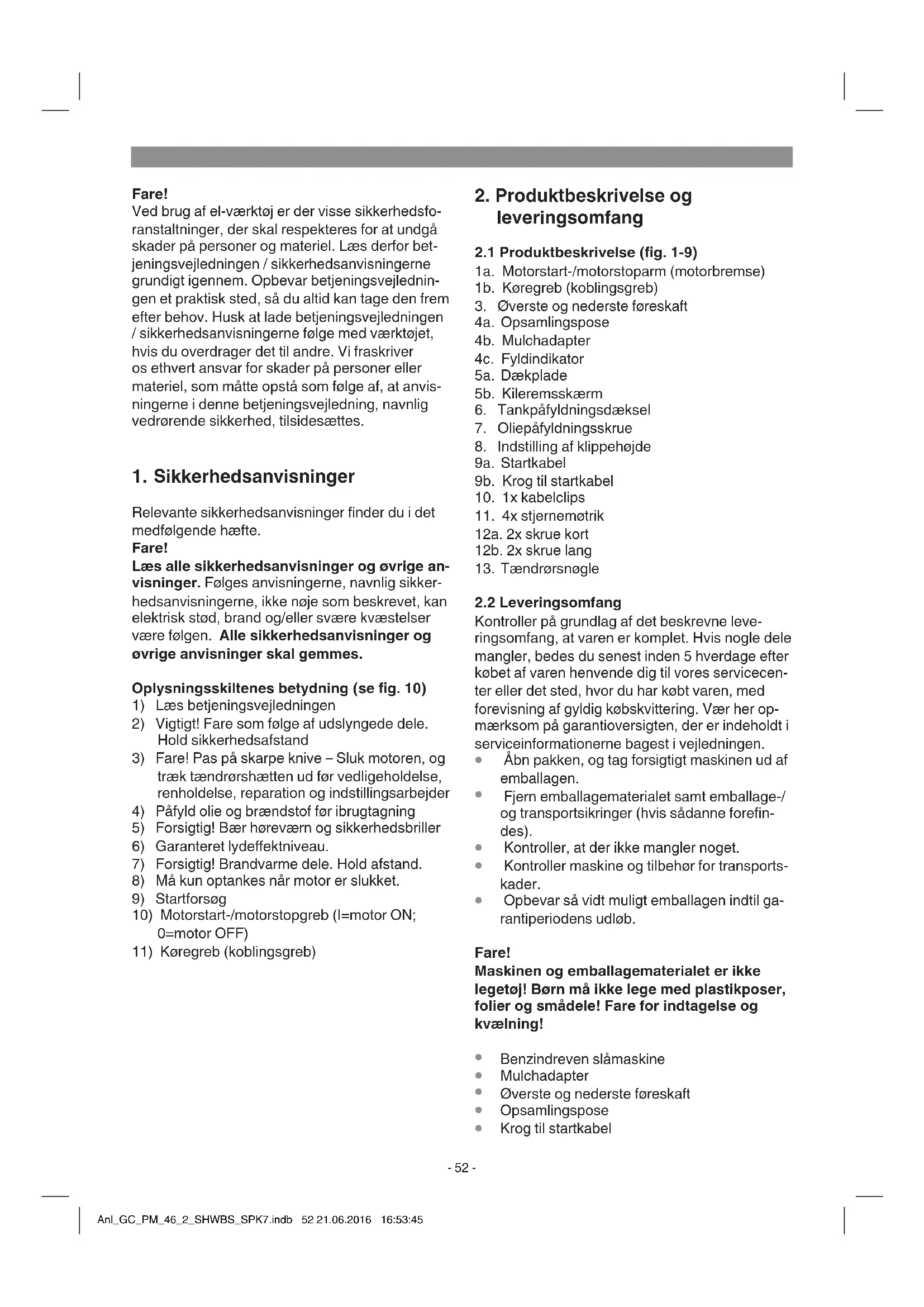 Bemærk! Der er ingen drivmidler på motoren ved leve- ring. Husk derfor at fylde olie og benzin på først. Information om vedligeholdelse af motoren inkl. vedligeholdelsesintervaller ndes i den vedlagte motorvejledning fra Briggs & Strat- ton. Advarsel: Brug altid kun en sikret benzindunk. Rygning er forbudt under påfyldning af benzin. Sluk motoren, og lad den køle af nogle minutter, før du fylder benzin på. Kontroller, at tændkablet er sluttet til tændrøret. Sikkerhedskontrol motorstart-/motorstop- greb For at sikre en uønsket start af græsslåmaskinen samt et hurtigt stop af motor og kniv, hvis der opstår en farlig situation, skal denne udstyres med en motorstart-/motorstopgreb (g. 5a/pos. 1a). Denne skal betjenes (g. 5b), før græsslå- maskinen startes. Når motorstart-/motorstopgre- bet slippes, skal dette vende tilbage til udgangs- positionen (g. 5a). Inden motoren startes, skal du gennemgå denne procedure nogle gange for at være sikker på, at greb og kabeltræk fungerer korrekt. Gentag denne test en gang til, når motoren er startet. Når motorstart-/motorstopgrebet er slup- pet, skal motoren stoppe i løbet af få sekunder. Er det ikke tilfældet, bedes du kontakte kundes- ervice. Fare: Skærekniven roterer, når motoren startes. Anl_GC_PM_46_2_SHWBS_SPK7.indb 54 21.06.2016 16:53:45DK/NDK/N