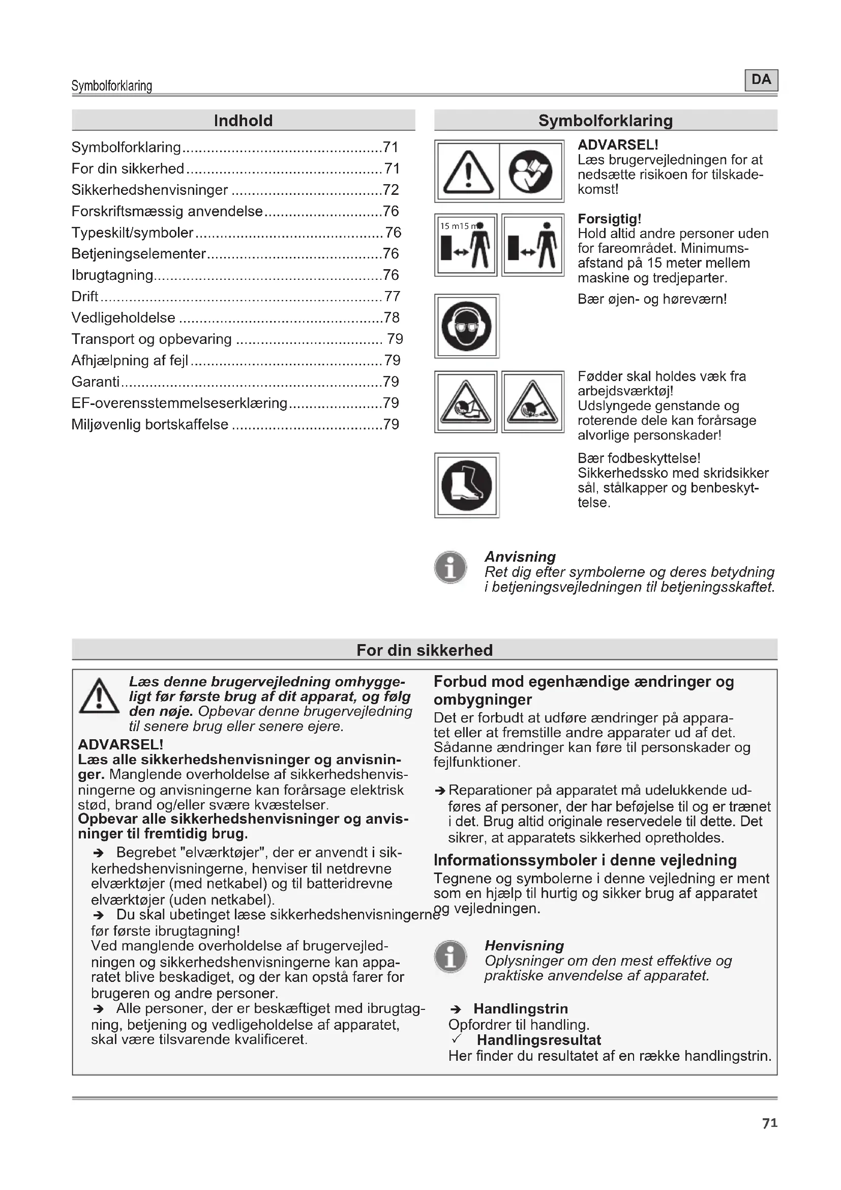 - Miljøvenlig bortskaffelse Symbolforklaring ADVARSEL! Læs brugervejledningen for at nedsætte risikoen for tilskade- komst! 15 m15 m Forsigtig! Hold altid andre personer uden for fareområdet. Minimums- afstand på 15 meter mellem maskine og tredjeparter. Bær øjen- og høreværn! Fødder skal holdes væk fra arbejdsværktøj! Udslyngede genstande og roterende dele kan forårsage alvorlige personskader! Bær fodbeskyttelse! Sikkerhedssko med skridsikker sål, stålkapper og benbeskyt- telse. Anvisning Ret dig efter symbolerne og deres betydning i betjeningsvejledningen til betjeningsskaftet. For din sikkerhed Læs denne brugervejledning omhygge- ligt før første brug af dit apparat, og følg den nøje. Opbevar denne brugervejledning til senere brug eller senere ejere. ADVARSEL! Læs alle sikkerhedshenvisninger og anvisnin- ger. Manglende overholdelse af sikkerhedshenvis- ningerne og anvisningerne kan forårsage elektrisk stød, brand og/eller svære kvæstelser. Opbevar alle sikkerhedshenvisninger og anvis- ninger til fremtidig brug. Î Begrebet "elværktøjer", der er anvendt i sik- kerhedshenvisningerne, henviser til netdrevne elværktøjer (med netkabel) og til batteridrevne elværktøjer (uden netkabel). Î Du skal ubetinget læse sikkerhedshenvisningerne før første ibrugtagning! Ved manglende overholdelse af brugervejled- ningen og sikkerhedshenvisningerne kan appa- ratet blive beskadiget, og der kan opstå farer for brugeren og andre personer. Î Alle personer, der er beskæftiget med ibrugtag- ning, betjening og vedligeholdelse af apparatet, skal være tilsvarende kvaliceret. Forbud mod egenhændige ændringer og ombygninger Det er forbudt at udføre ændringer på appara- tet eller at fremstille andre apparater ud af det. Sådanne ændringer kan føre til personskader og fejlfunktioner. Î Reparationer på apparatet må udelukkende ud- føres af personer, der har beføjelse til og er trænet i det. Brug altid originale reservedele til dette. Det sikrer, at apparatets sikkerhed opretholdes. Informationssymboler i denne vejledning Tegnene og symbolerne i denne vejledning er ment som en hjælp til hurtig og sikker brug af apparatet og vejledningen. Henvisning Oplysninger om den mest effektive og praktiske anvendelse af apparatet. Î Handlingstrin Opfordrer til handling. 3 Handlingsresultat Her nder du resultatet af en række handlingstrin. IndholdFor din sikkerhed p. 79