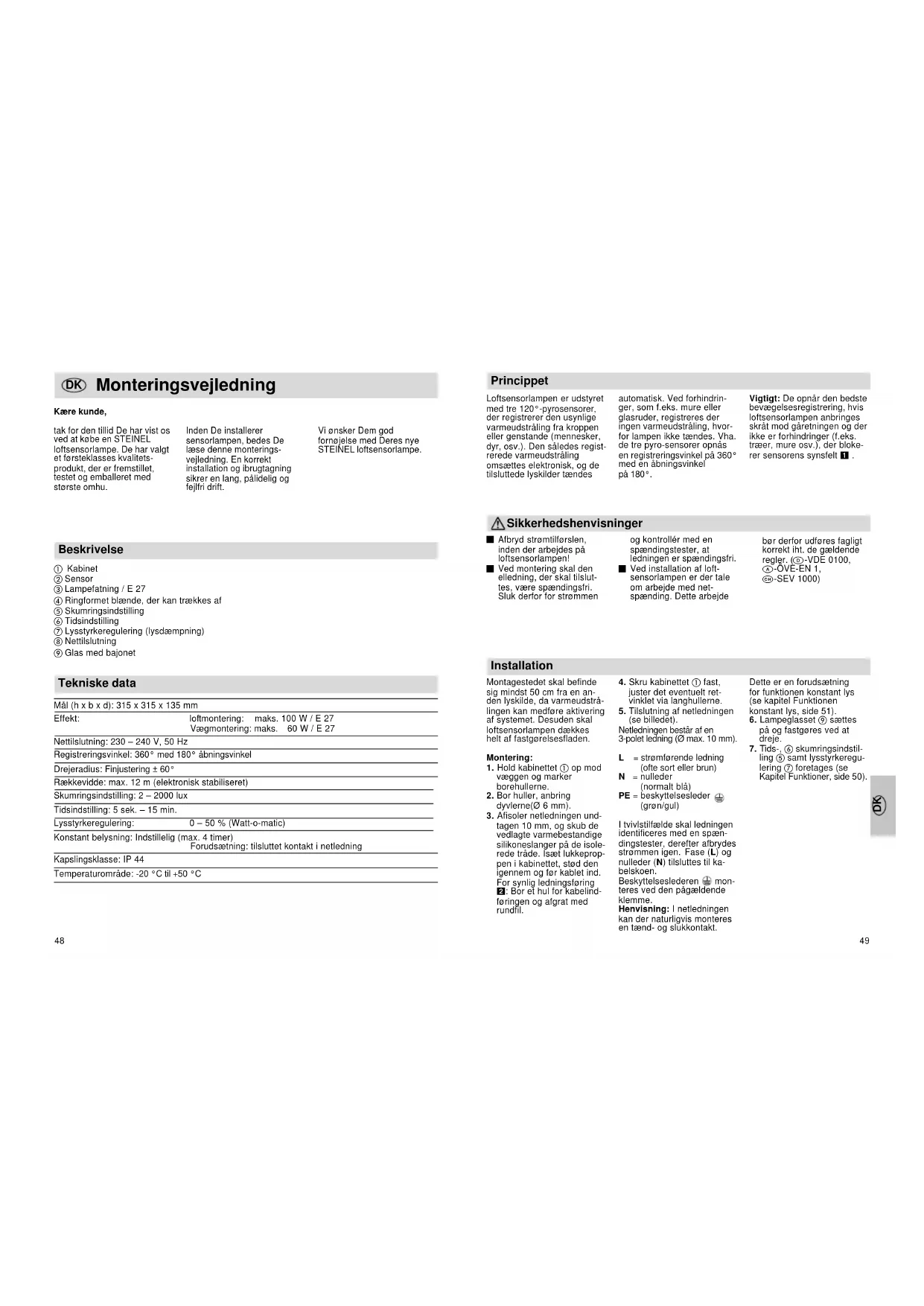 -SEV 1000) Mål (h x b x d): 315 x 315 x 135 mm Effekt: loftmontering: maks. 100 W / E 27 Vægmontering: maks. 60 W / E 27 Nettilslutning: 230 – 240 V, 50 Hz Registreringsvinkel: 360° med 180° åbningsvinkel Drejeradius: Finjustering ± 60° Rækkevidde: max. 12 m (elektronisk stabiliseret) Skumringsindstilling: 2 – 2000 lux Tidsindstilling: 5 sek. – 15 min. Lysstyrkeregulering: 0 – 50 % (Watt-o-matic) Konstant belysning: Indstillelig (max. 4 timer) Forudsætning: tilsluttet kontakt i netledning Kapslingsklasse: IP 44 Temperaturområde: -20 °C til +50 °C Monteringsvejledning Kære kunde, tak for den tillid De har vist os ved at købe en STEINEL loftsensorlampe. De har valgt et førsteklasses kvalitets- produkt, der er fremstillet, testet og emballeret med største omhu. Inden De installerer sensorlampen, bedes De læse denne monterings- vejledning. En korrekt installation og ibrugtagning sikrer en lang, pålidelig og fejlfri drift. Beskrivelse a. Kabinet b Sensor c Lampefatning / E 27 d Ringformet blænde, der kan trækkes af e Skumringsindstilling f Tidsindstilling g Lysstyrkeregulering (lysdæmpning) h Nettilslutning i Glas med bajonet Tekniske data Vi ønsker Dem god fornøjelse med Deres nye STEINEL loftsensorlampe.