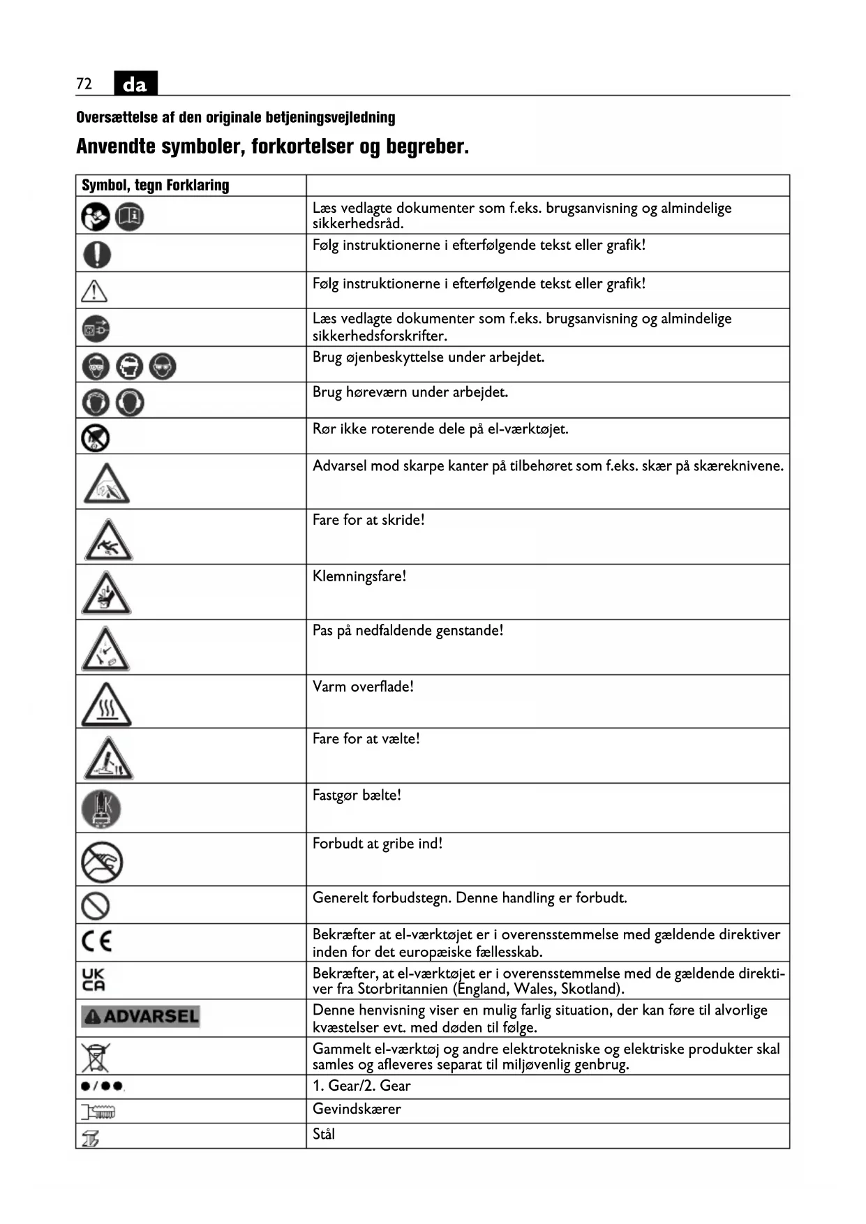Oversættelse af den originale betjeningsvejledning Anvendte symboler, forkortelser og begreber. Symbol, tegn Forklaring Læs vedlagte dokumenter som f.eks. brugsanvisning og almindelige sikkerhedsråd. Følg instruktionerne i efterfølgende tekst eller grafik! Følg instruktionerne i efterfølgende tekst eller grafik! Læs vedlagte dokumenter som f.eks. brugsanvisning og almindelige sikkerhedsforskrifter. Brug øjenbeskyttelse under arbejdet. Brug høreværn under arbejdet. Rør ikke roterende dele på el-værktøjet. Advarsel mod skarpe kanter på tilbehøret som f.eks. skær på skæreknivene. Fare for at skride! Klemningsfare! Pas på nedfaldende genstande! Varm overflade! Fare for at vælte! Fastgør bælte! Forbudt at gribe ind! Generelt forbudstegn. Denne handling er forbudt. Bekræfter at el-værktøjet er i overensstemmelse med gældende direktiver inden for det europæiske fællesskab. Bekræfter, at el-værktøjet er i overensstemmelse med de gældende direkti- ver fra Storbritannien (England, Wales, Skotland). Denne henvisning viser en mulig farlig situation, der kan føre til alvorlige kvæstelser evt. med døden til følge. Gammelt el-værktøj og andre elektrotekniske og elektriske produkter skal samles og afleveres separat til miljøvenlig genbrug.
