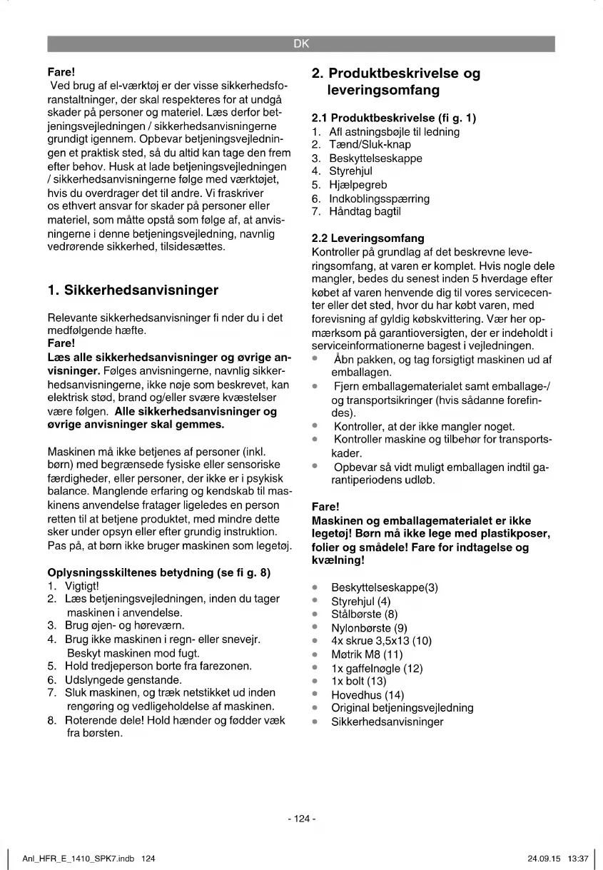 Relevante sikkerhedsanvisninger fi nder du i det medfølgende hæfte. Fare! Læs alle sikkerhedsanvisninger og øvrige an- visninger. Følges anvisningerne, navnlig sikker- hedsanvisningerne, ikke nøje som beskrevet, kan elektrisk stød, brand og/eller svære kvæstelser være følgen. Alle sikkerhedsanvisninger og øvrige anvisninger skal gemmes. Maskinen må ikke betjenes af personer (inkl. børn) med begrænsede fysiske eller sensoriske færdigheder, eller personer, der ikke er i psykisk balance. Manglende erfaring og kendskab til mas- kinens anvendelse fratager ligeledes en person retten til at betjene produktet, med mindre dette sker under opsyn eller efter grundig instruktion. Pas på, at børn ikke bruger maskinen som legetøj. Oplysningsskiltenes betydning (se fi g. 8)