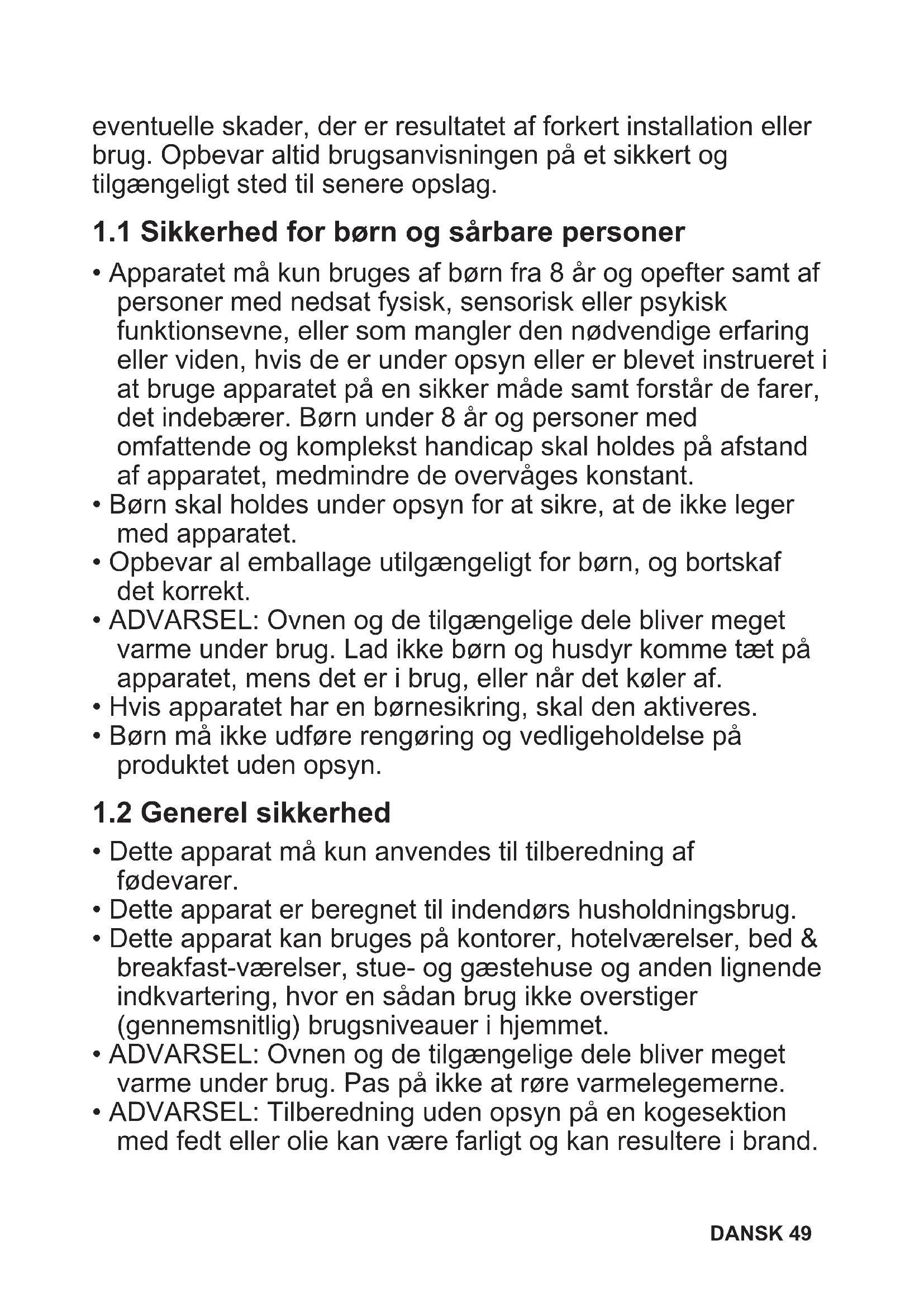 - ADVARSEL: Ovnen og de tilgængelige dele bliver meget varme under brug. Lad ikke børn og husdyr komme tæt på apparatet, mens det er i brug, eller når det køler af.