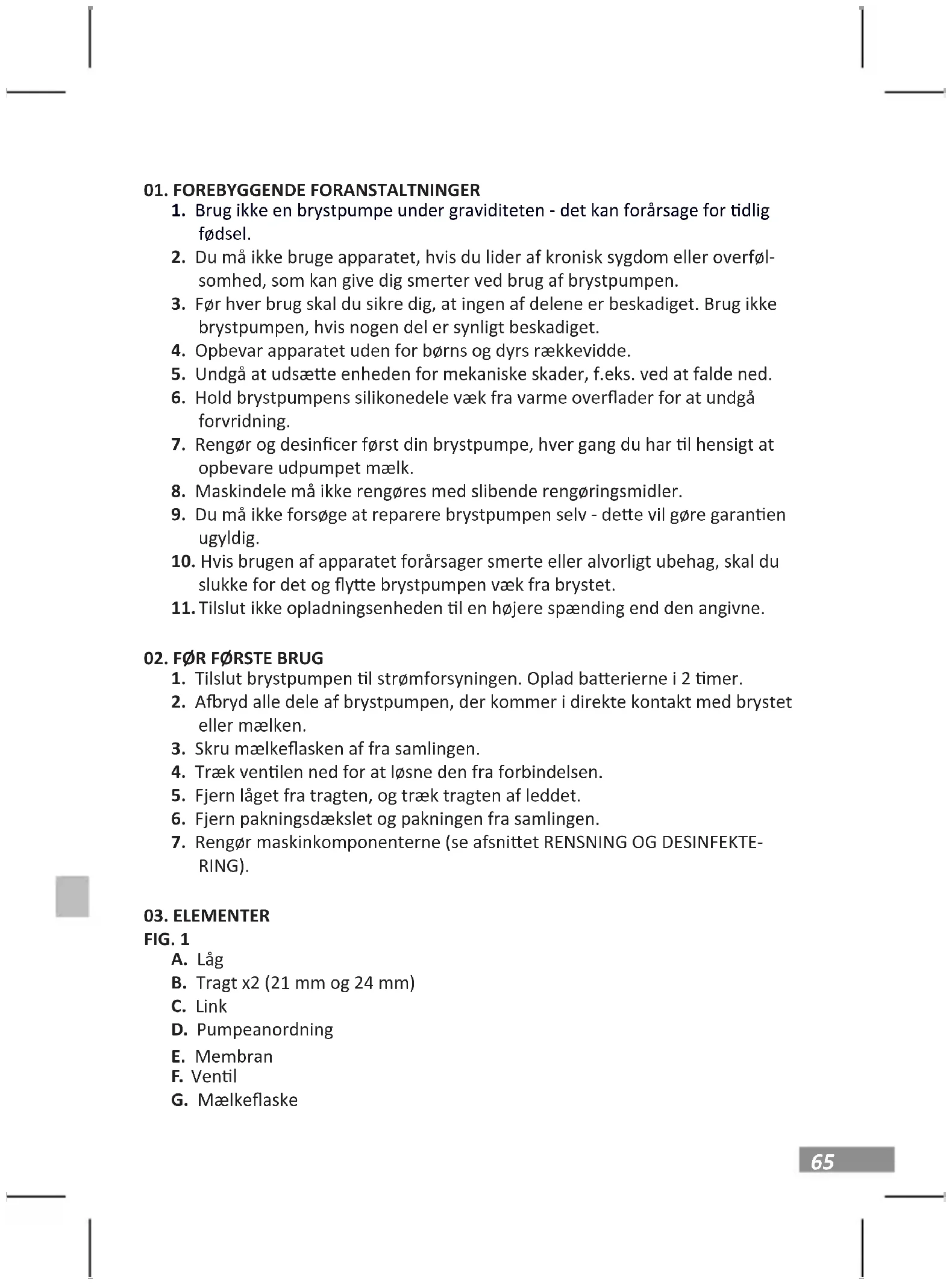 Vask og desincering er to forskellige operaoner. De skal udføres separat for at beskye dit barn og for at sikre, at brystpumpen fungerer korrekt. Vask - vask - vask af enhedens overade og ernelse af snavs. Desinfekon - dræber organismer som f.eks. bakterier eller vira, der kan være l stede på udstyrets overade. Tragt og tragtlåg, dele l brystpumpe (led, pakning, pakningsdæksel), aske og sut: Vask og desincer før første brug. Vask eer hver brug. Desinfekon en gang om dagen. BEMÆRK: - Adskil og vask alle maskindele, der kommer i kontakt med mælk, straks eer brug af maskinen. Dee vil erne eventuelle mælkerester og forhindre bakterievækst. - Brug kun drikkevand fra hanen l vask. Brug vand på aske, hvis vandet i din vandhane ikke opfylder dee krav. - Ved rengøring af venlerne må du ikke bruge børster. Pas på ikke at punktere67 venlen på vej ud. - Afmonter, vask og skyl alle dele af brystpumpen, der kommer i kontakt med mælk, undtagen pumpeanordningen. - Brug en mild opvaskemiddel eller sæbe, når du vasker brystpumpens dele. FIG. 3.A
