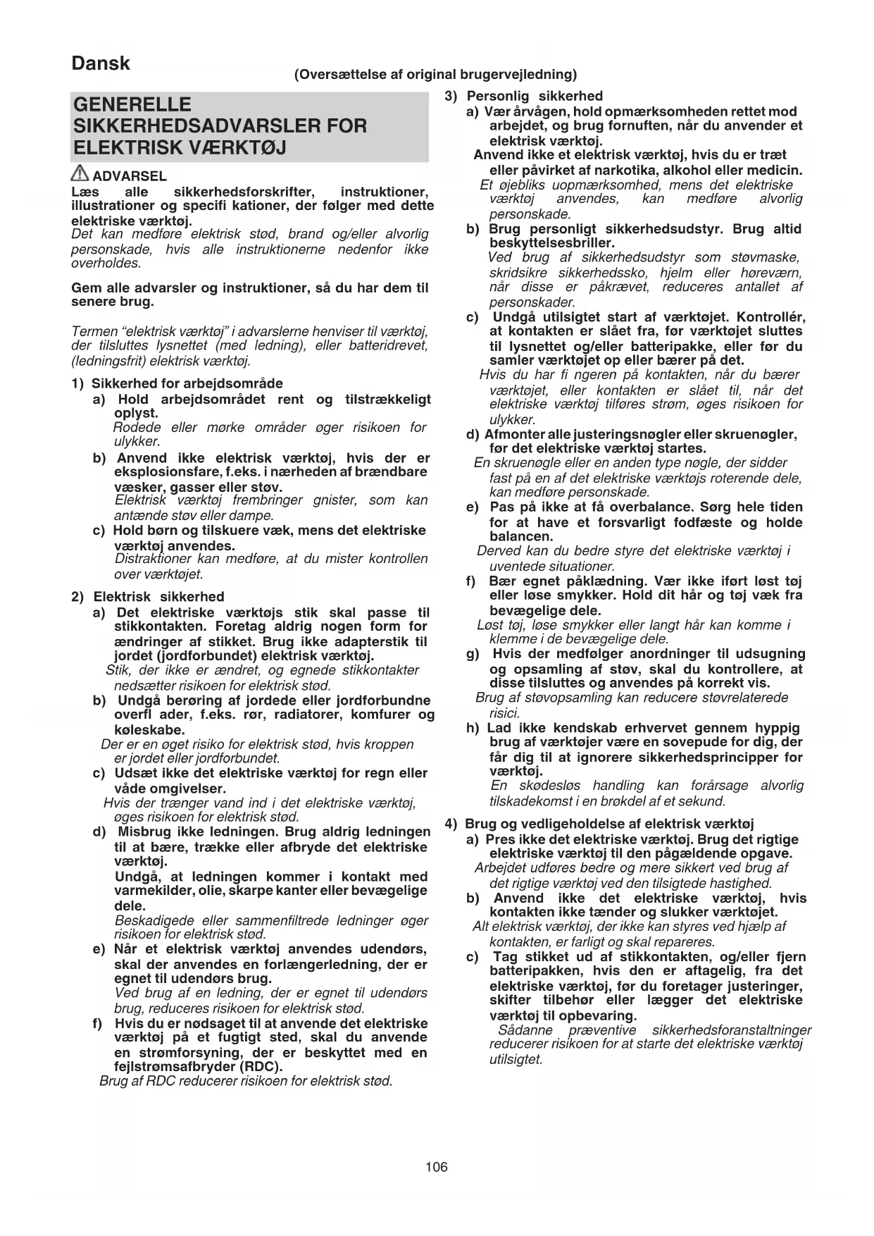 a) Det elektriske værktøjs stik skal passe til stikkontakten. Foretag aldrig nogen form for ændringer af stikket. Brug ikke adapterstik til jordet (jordforbundet) elektrisk værktøj. Stik, der ikke er ændret, og egnede stikkontakter nedsætter risikoen for elektrisk stød. b) Undgå berøring af jordede eller jordforbundne overfl ader, f.eks. rør, radiatorer, komfurer og køleskabe. Der er en øget risiko for elektrisk stød, hvis kroppen er jordet eller jordforbundet. c) Udsæt ikke det elektriske værktøj for regn eller våde omgivelser. Hvis der trænger vand ind i det elektriske værktøj, øges risikoen for elektrisk stød. d) Misbrug ikke ledningen. Brug aldrig ledningen til at bære, trække eller afbryde det elektriske værktøj. Undgå, at ledningen kommer i kontakt med varmekilder, olie, skarpe kanter eller bevægelige dele. Beskadigede eller sammenfi ltrede ledninger øger risikoen for elektrisk stød. e) Når et elektrisk værktøj anvendes udendørs, skal der anvendes en forlængerledning, der er egnet til udendørs brug. Ved brug af en ledning, der er egnet til udendørs brug, reduceres risikoen for elektrisk stød. f) Hvis du er nødsaget til at anvende det elektriske værktøj på et fugtigt sted, skal du anvende en strømforsyning, der er beskyttet med en fejlstrømsafbryder (RDC). Brug af RDC reducerer risikoen for elektrisk stød. (Oversættelse af original brugervejledning) 00BookG1812DEEU.indb10600BookG1812DEEU.indb106 2022/11/2814:51:202022/11/2814:51:20107 Dansk d) Opbevar elektrisk værktøj, der ikke er i brug, utilgængeligt for børn, og lad ikke personer, der ikke er vant til elektrisk værktøj, eller som ikke har læst denne vejledning, anvende det elektriske værktøj. Elektrisk værktøj er farligt i hænderne på uerfarne brugere. e) Vedligehold elektrisk værktøj og tilbehør. Kontrollér for bevægelige dele, der er monteret forkert eller sidder fast, defekte dele eller andre forhold, der kan påvirke det elektriske værktøjs drift. Hvis det elektriske værktøj er beskadiget, skal det repareres før brug. Mange ulykker skyldes dårligt vedligeholdt elektrisk værktøj. f) Sørg for, at skæreværktøj er skarpt og rent. Der er mindre risiko for, at korrekt vedligeholdt skæreværktøj med skarpe kanter sætter sig fast, og det er nemmere at styre. g) Brug det elektriske værktøj, tilbehør og bits osv. i overensstemmelse med denne vejledning under hensyntagen til arbejdsforholdene og det arbejde, der skal udføres. Der kan opstå farlige situationer, hvis det elektriske værktøj bruges til andre formål end de tilsigtede. h) Hold håndtag og gribefl ader tørre, rene og fri for olie og fedt. Glatte håndtag og gribefl ader gør sikker håndtering og kontrol over værktøjet i uventede situationer umulig.