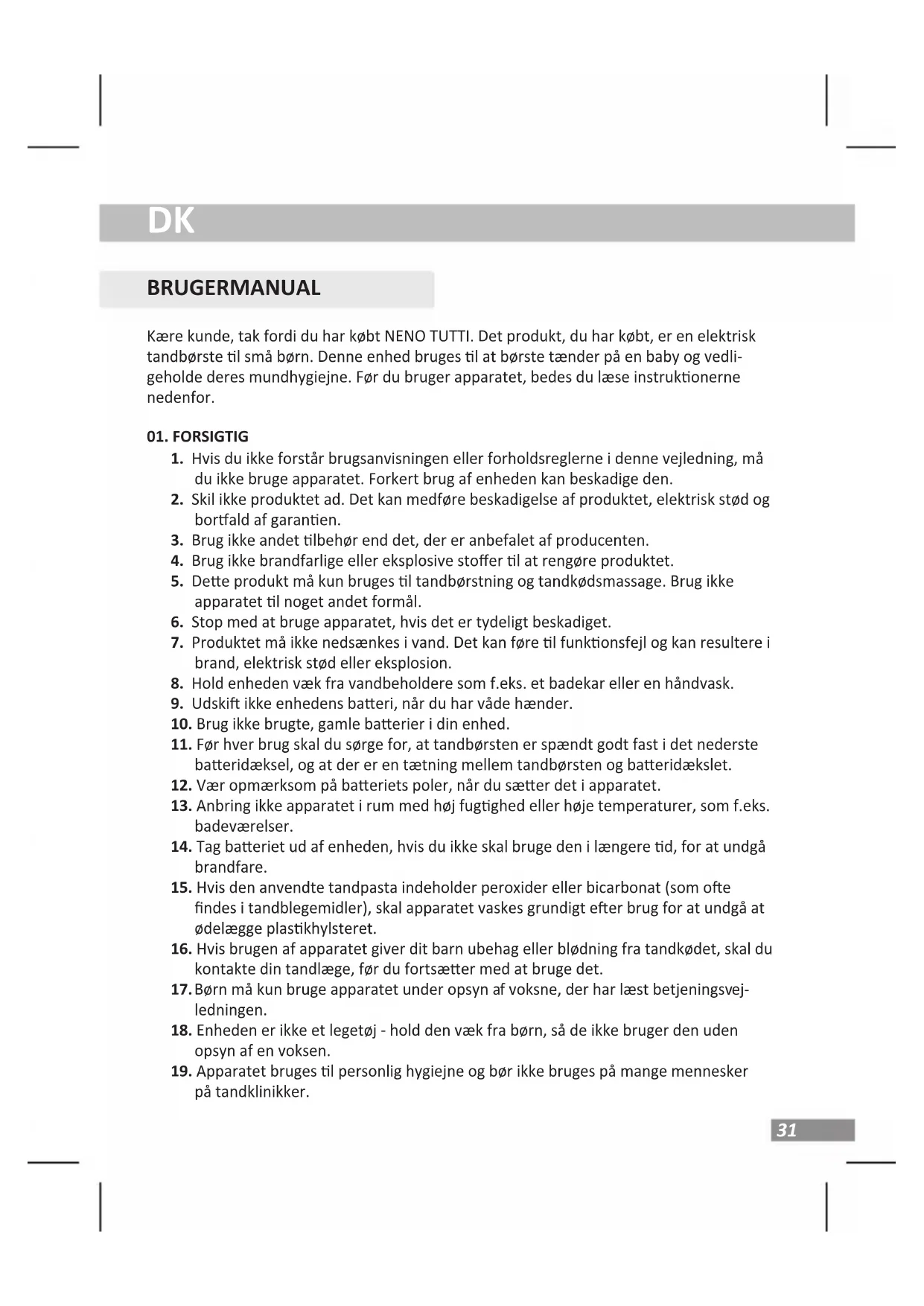BRUGERMANUAL Kære kunde, tak fordi du har købt NENO TUTTI. Det produkt, du har købt, er en elektrisk tandbørste l små børn. Denne enhed bruges l at børste tænder på en baby og vedli- geholde deres mundhygiejne. Før du bruger apparatet, bedes du læse instrukonerne nedenfor.
