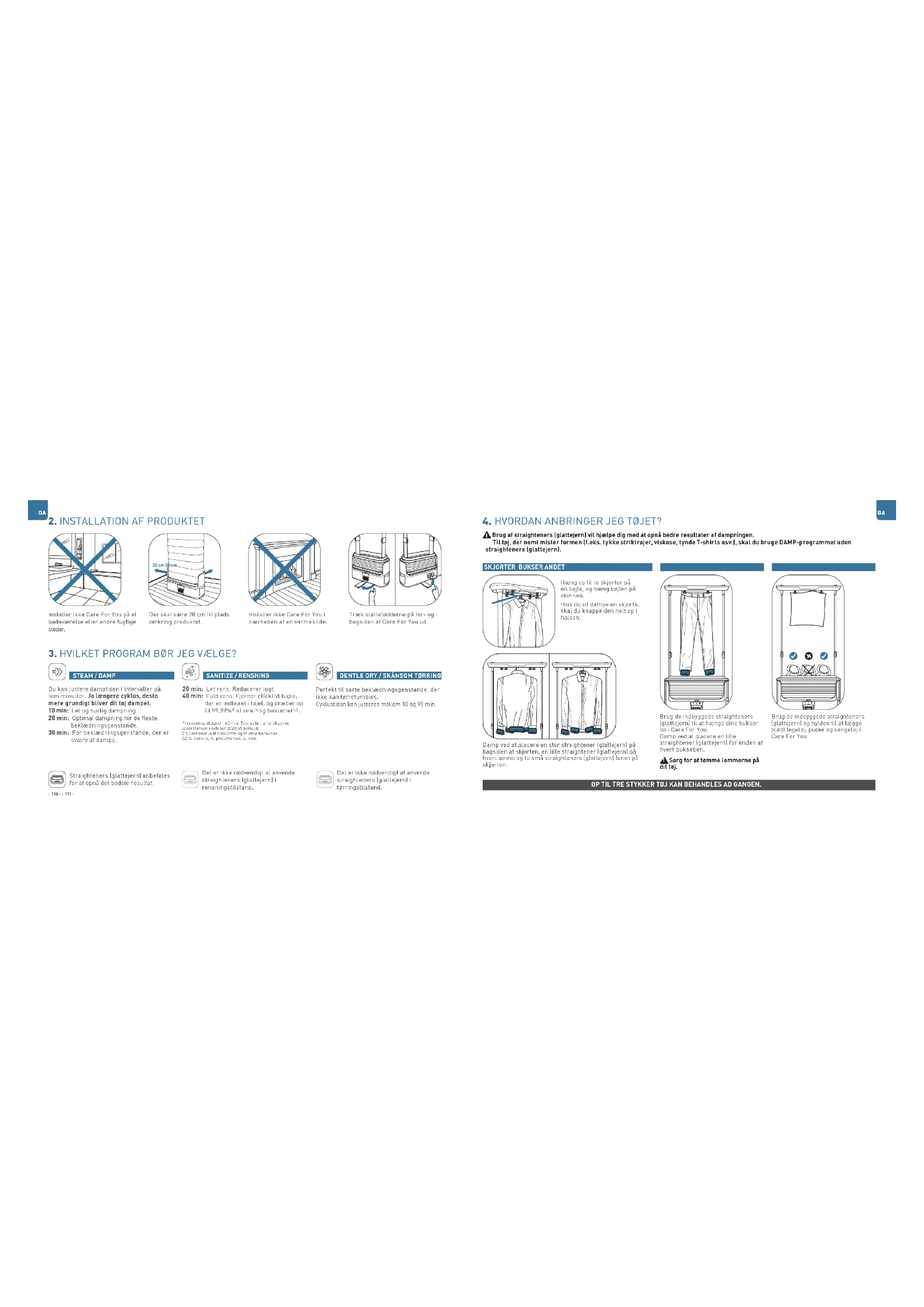 STEAM / DAMP Du kan justere damptiden i intervaller på fem minutter. Jo længere cyklus, desto mere grundigt bliver dit tøj dampet. 10 min: Let og hurtig dampning. 20 min: Optimal dampning for de fleste beklædningsgenstande. 30 min: For beklædningsgenstande, der er svære at dampe. SANITIZE / RENSNING 20 min: Let rens. Reducerer lugt. 40 min: Fuld rens. Fjerner effektivt lugte, der er indlejret i tøjet, og dræber op til 99,99%* af vira (1) og bakterier (2)